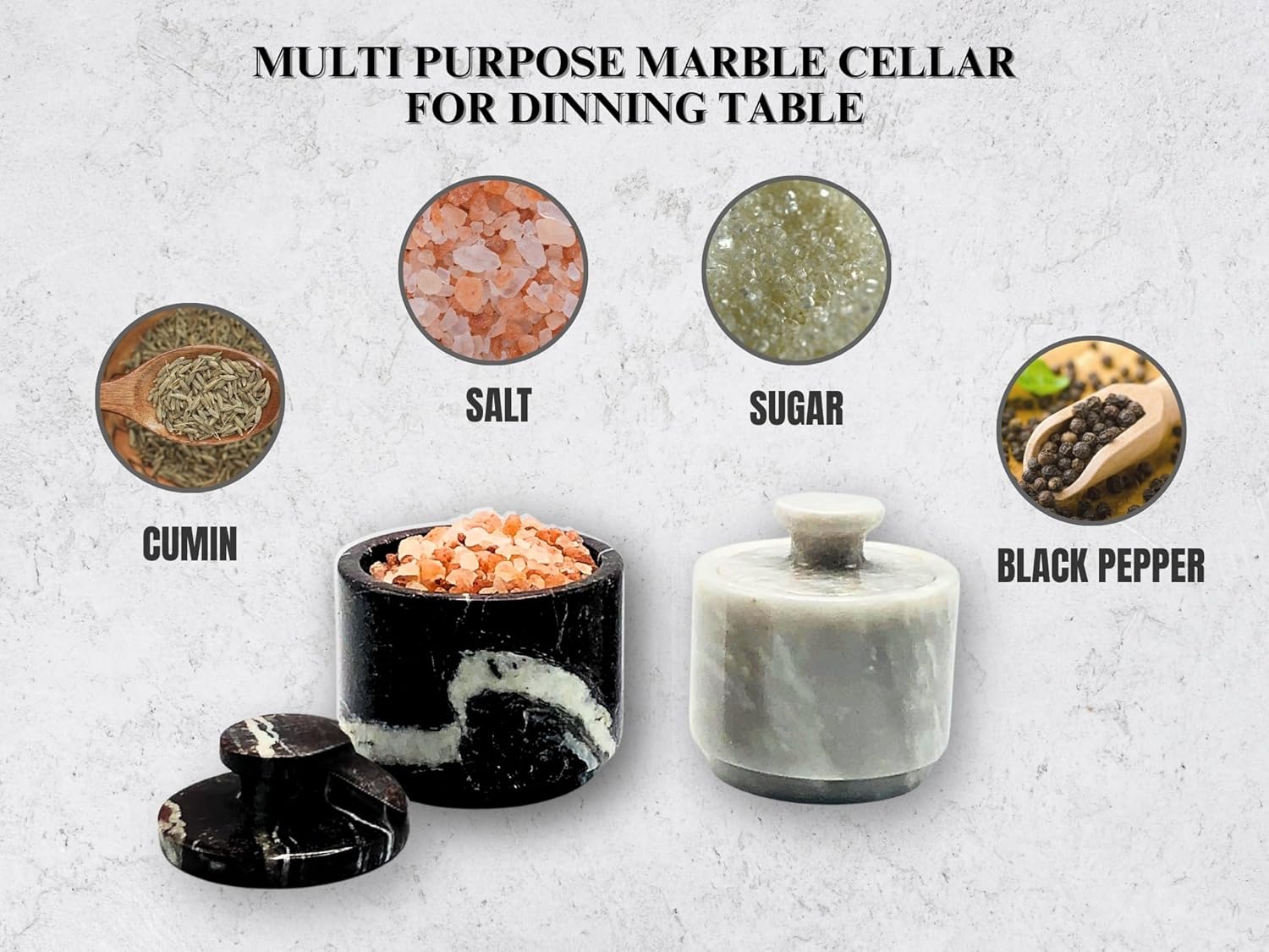 Premium Marble Salt Cellar with Lid 2 Pack | 3.5 oz Kitchen Storage Container | Elegant Cooking Salt Box | Spice Jar Keeper for Counter (White Black Zebra)
