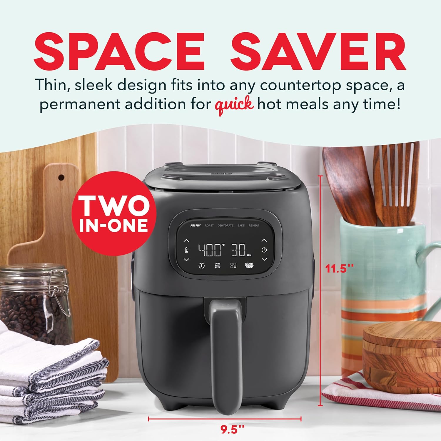 Dash Flip & Fry™ Digital 2-in-1 Grill + Air Fryer with 5 functions, 3 Qt Capacity, Air fryer & Indoor Grill for fries, wings, burgers and more - Forged Iron