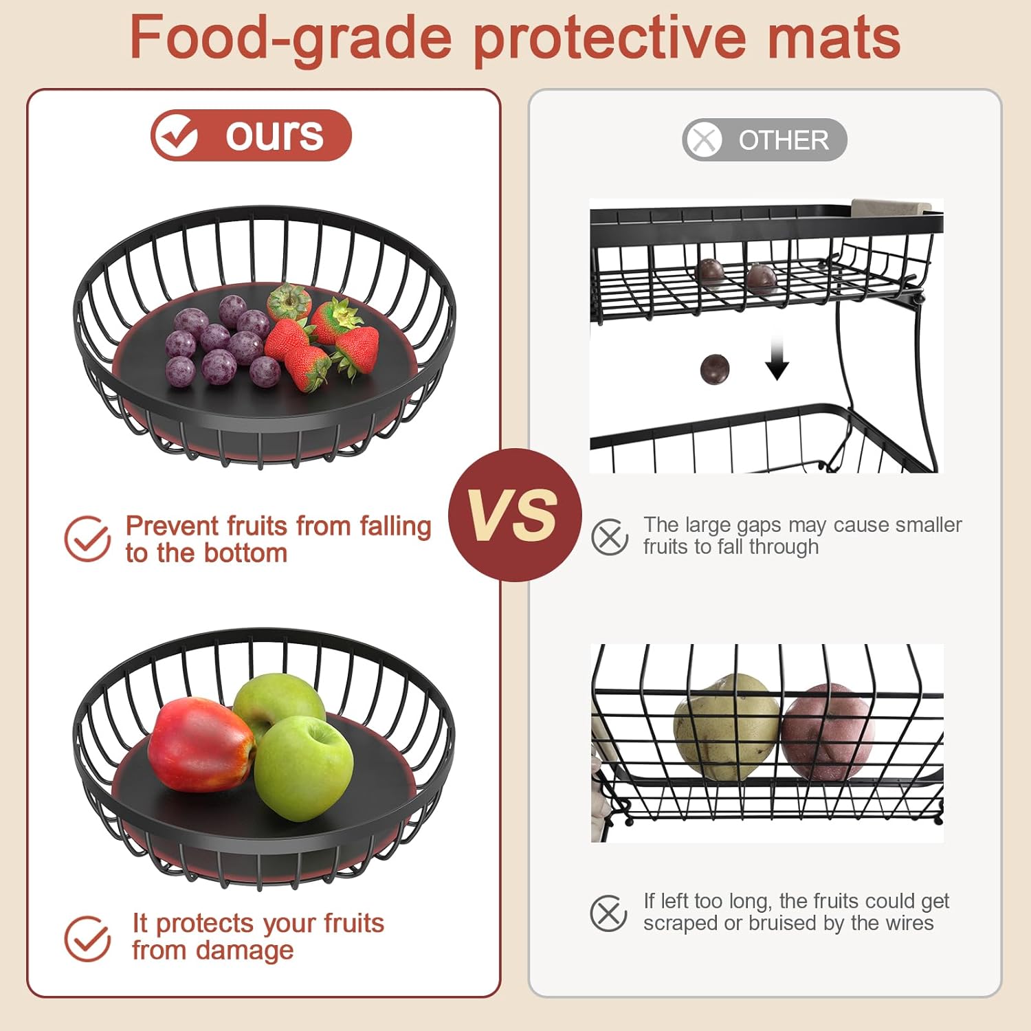 - Protects Fruit: Features a food-grade protective liner to prevent small fruits from falling and avoid pressure marks. Perfect fruit holder.