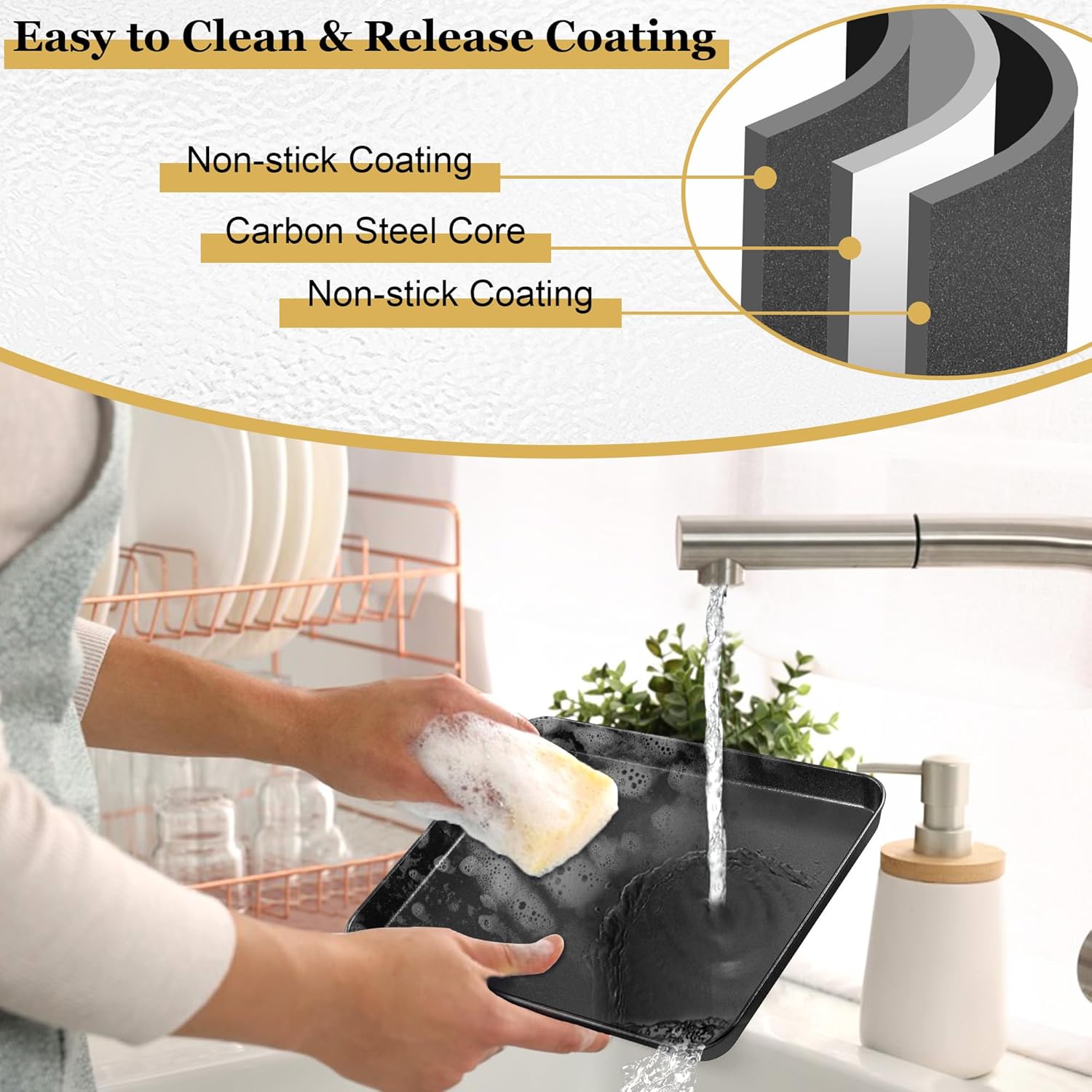 - EVEN AND FAST HEAT DISTRIBUTION: High carbon steel core with flat surface, Stable metal with heavy gauge design helps to transfer heat rapidly and evenly, Maximum ensure the pastry in good flavor without overcook or undercook, Freezer safe and oven safe up to 450ยฐF without warping, Sturdy gauge construction makes them can be repeat used for daily meals, Practical carbon steel bakeware for your kitchen