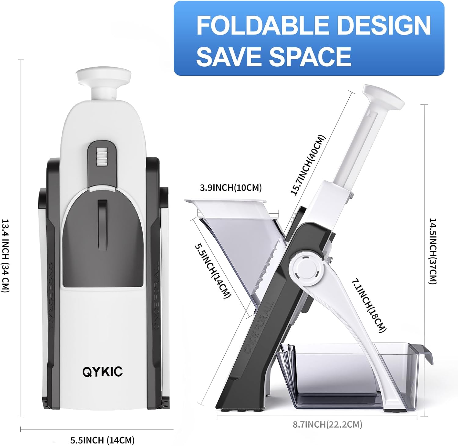 - EASY TO CLEAN: Our mandoline food slicer is designed Foldable and compact design, takes up little cabinet space,Rinse under the tap or put directly into the dishwasher, this vegetable slicer is great tool for kitchen with exquisite packaging is perfect new home gift.