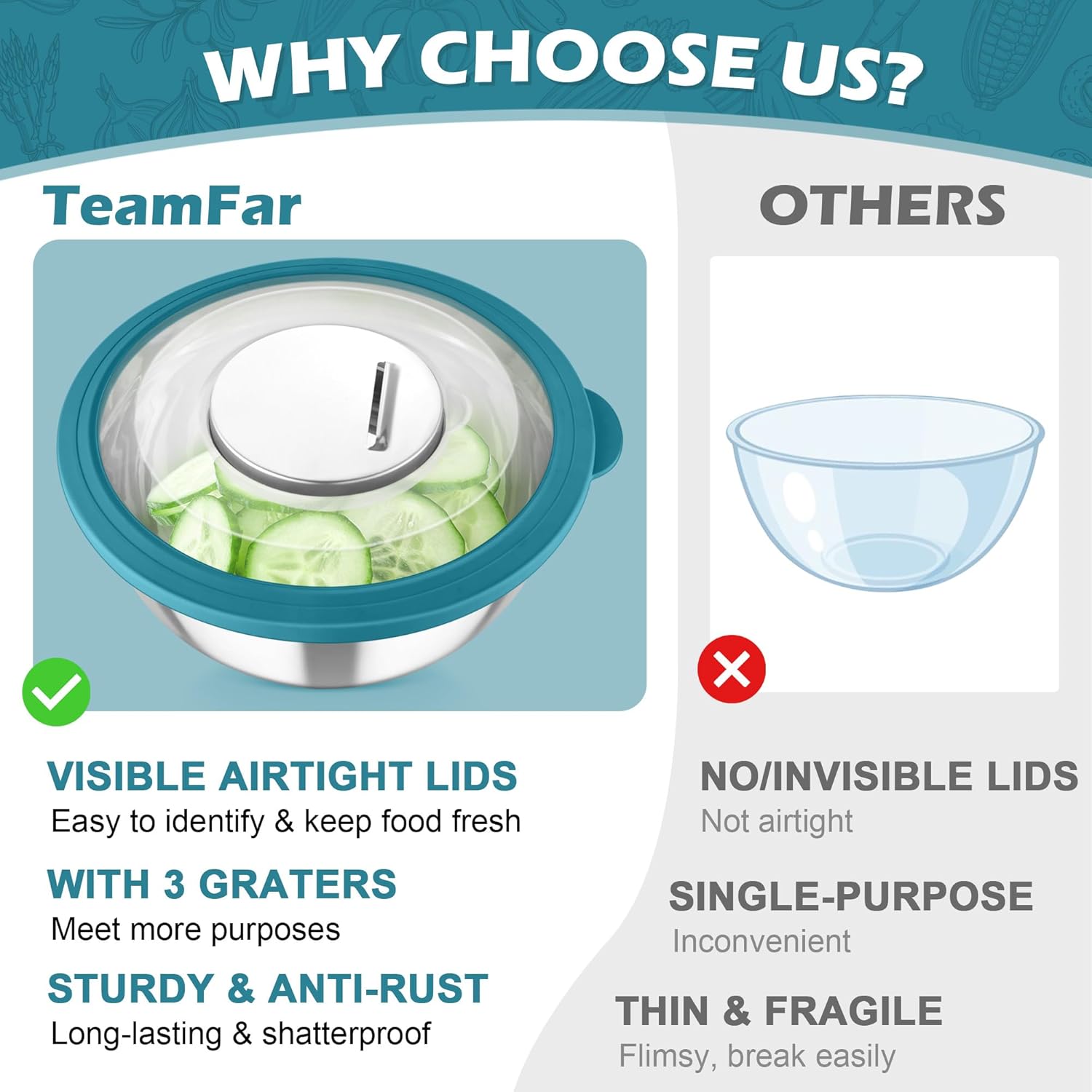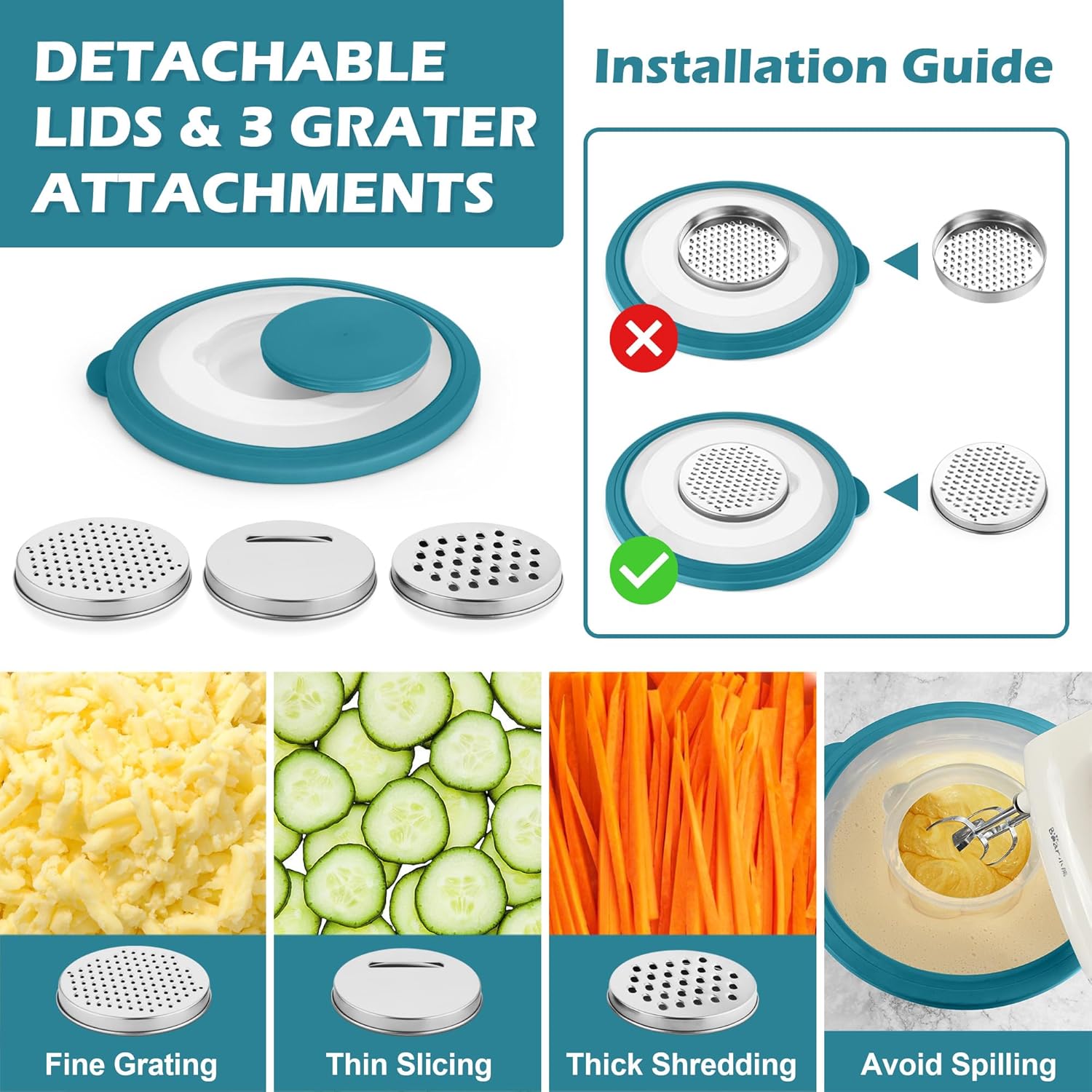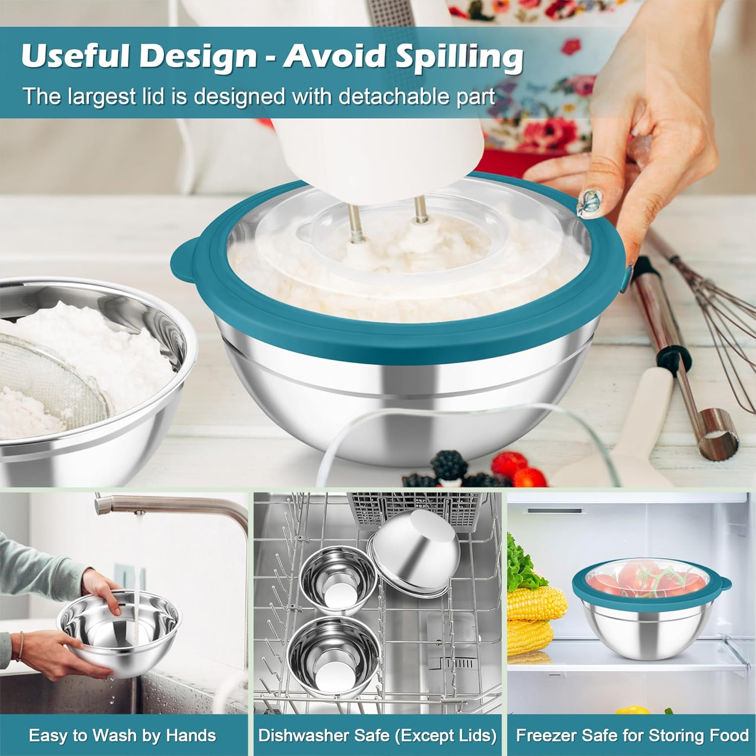 - TRANSPARENT LIDS & 3 GRATERS: Every stainless steel mixing bowl offers a visible clear tight-fitting lid, Easy to see through and identify whatโs in the bowl, Leak-proof to prevent liquid spills, Ideal for storing food in freezer to keep it fresh and clean, The largest lid has a detachable section, 3 grater attachments can be simply placed directly on the center of lid for slicing /grating /shredding, Practical for meal-preparing, No need to take away the entire lid to avoid splashing or spilling when whisking