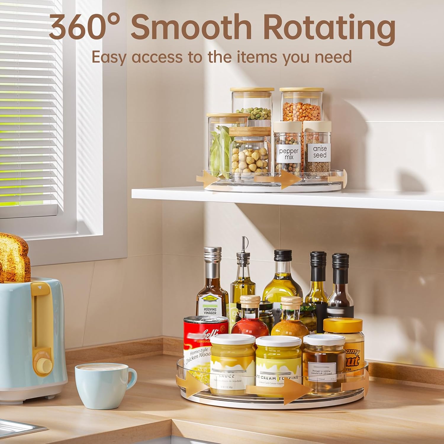- Smooth 360° Rotation for Easy Access: The pantry lazy susan organizer rotates a silky 360 degrees for easy access. With a simple spin, items are within easy reach, making your daily life easier