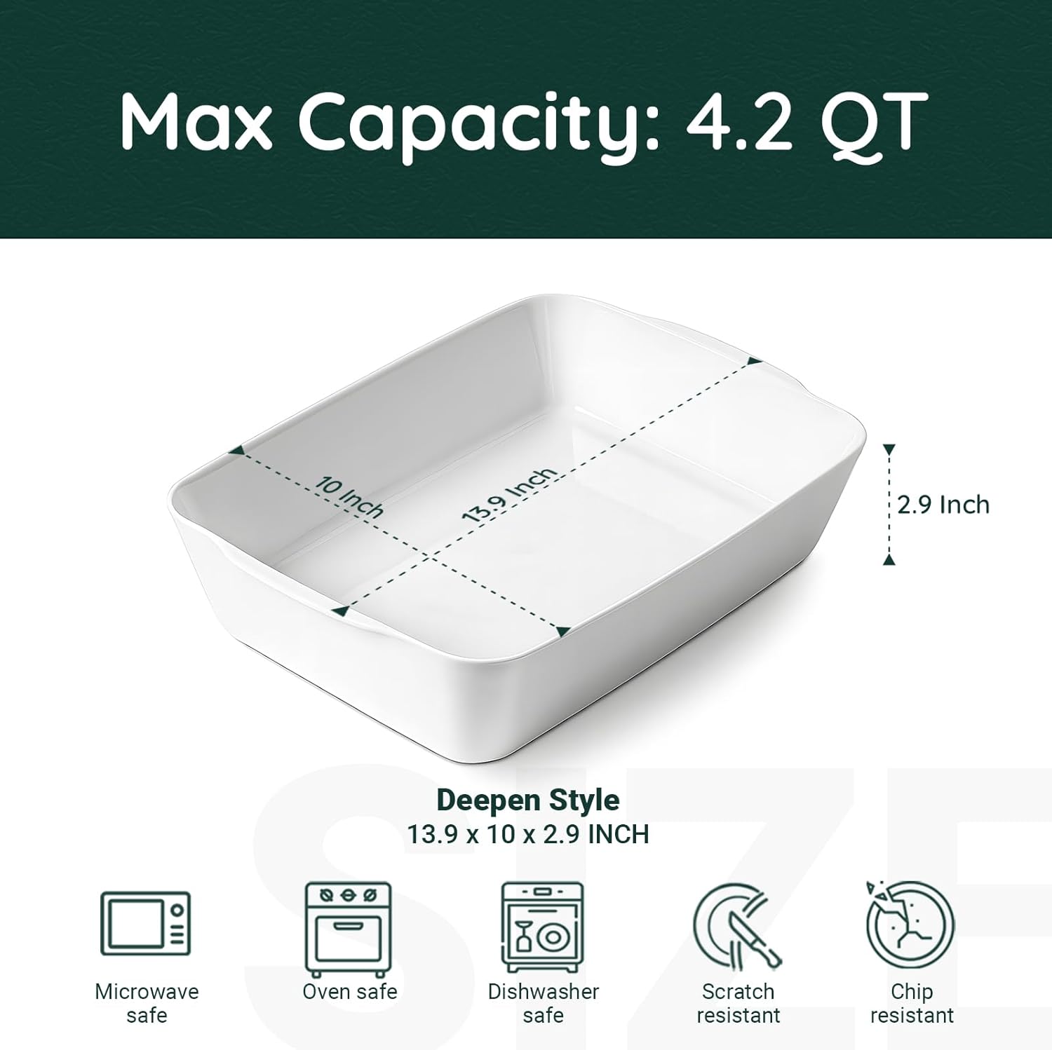 4.2 QT Deep Ceramic Baking Dish, White Casserole Dish, Lasagna Pan for Oven, Ceramic Baking Pan, Kitchen Decor, Microwave Oven Safe, Dinner, Wedding (10" x 13.9")