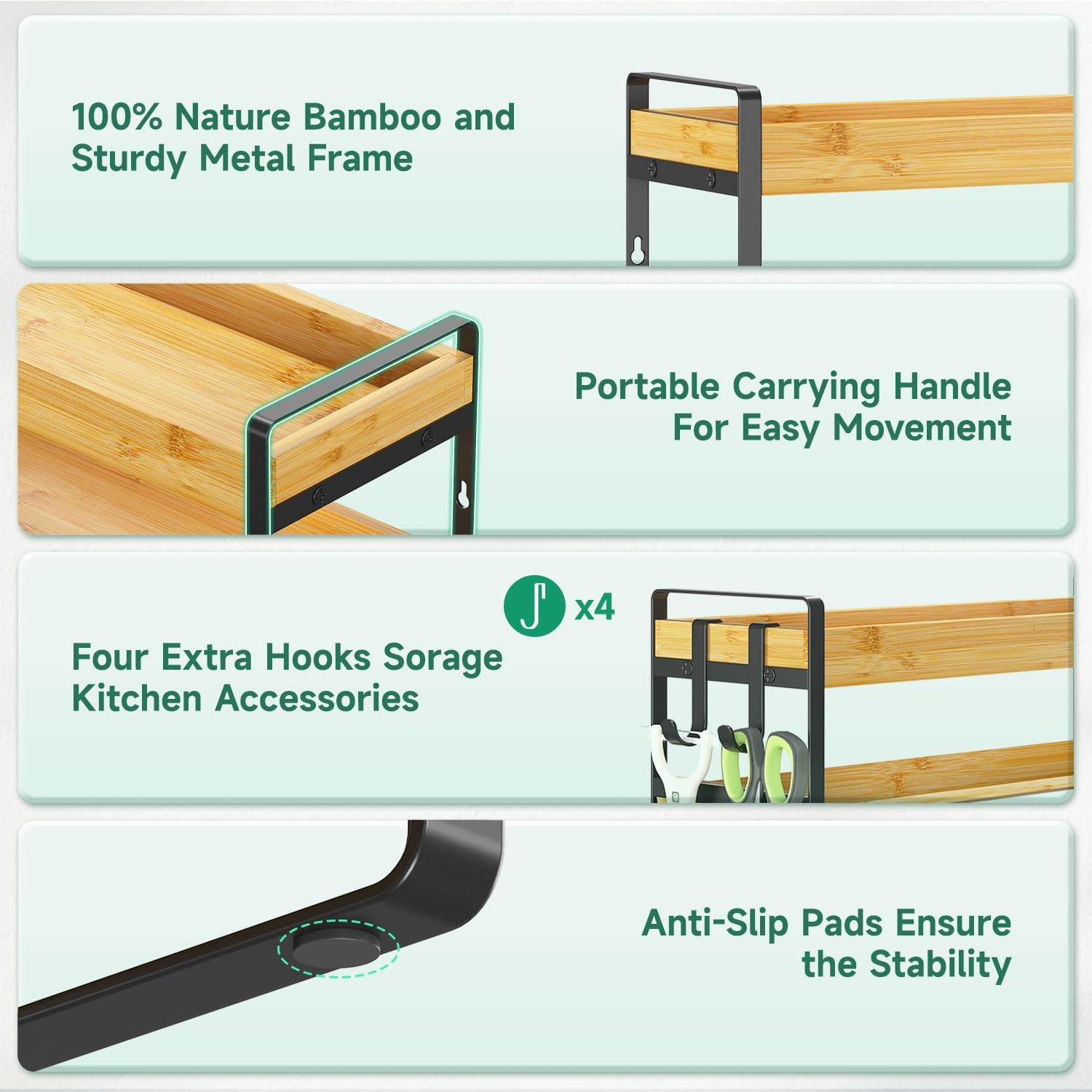 - 4 Hooks & Anti-Slip Pads: Comes with 4 movable hooks to hang kitchen utensils and 4 anti-slip pads to keep the pantry spice rack organizer stable and protect your surfaces from scratches and shifting