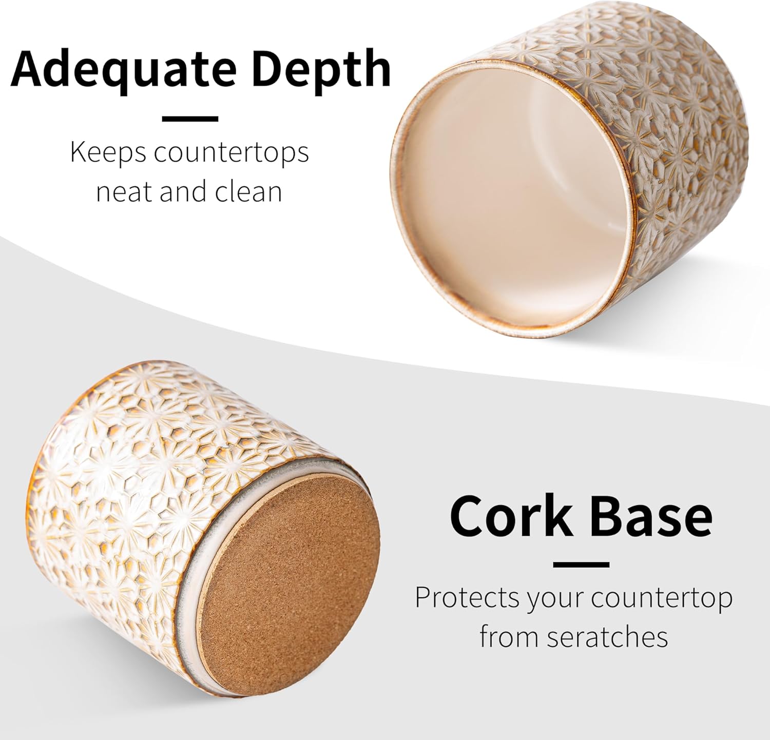 Utensil Holder Rustic Farmhouse Ceramic Utensil Crock for Countertop - 5.3" Handcrafted Kitchen Cooking Utensil Crocks with Cork Base, Natural Finish for Kitchen Tools Storage