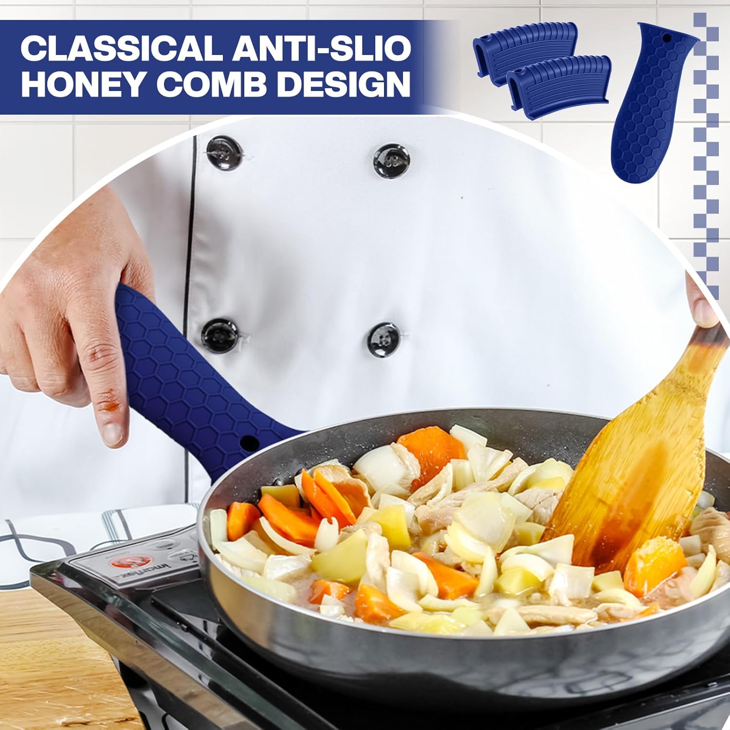 - Package Content: there are 4 pieces of silicone hot handle holders that come in navy blue, 4 pieces of silicone assist handle holders available in navy blue, enough quantity and classic style enough for your daily use, can be changed and shared, and easy to find; Suitable for using at home, travel or camping, nice gift for Mother's day, birthday, holidays, housewarming, chef and hostess