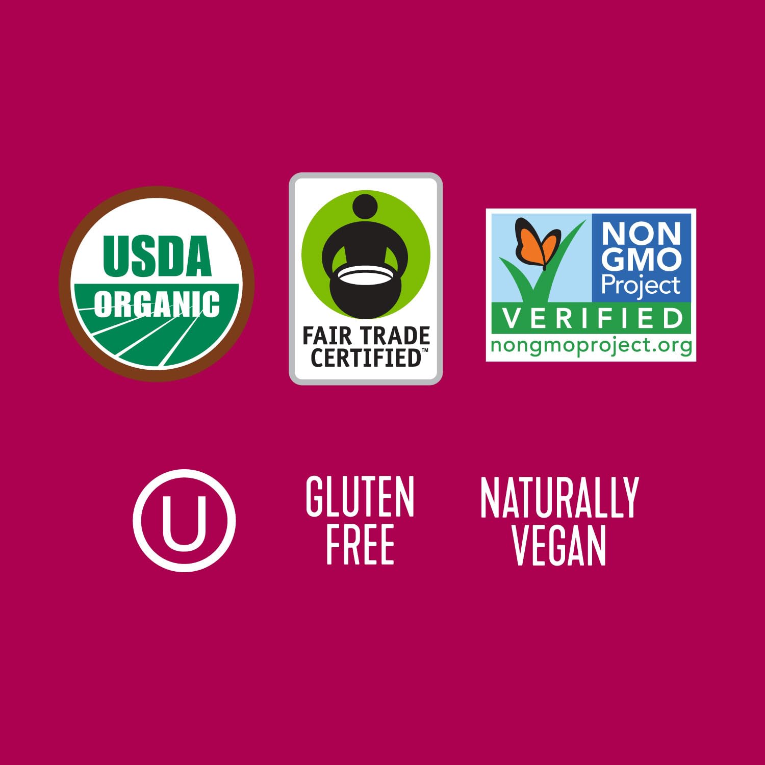 - CERTIFIABLE QUALITY: USDA Organic, Fair Trade Certified, Non-GMO Project Verified, Kosher Certified, Gluten Free and Naturally Vegan