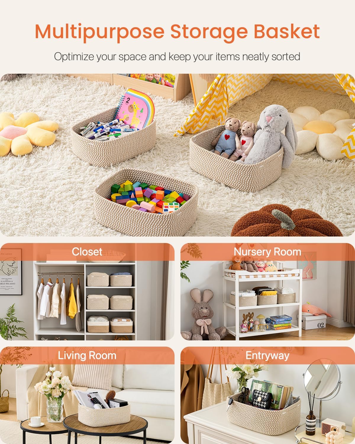 - [ Elegantly Designed to Match Any Dรฉcor ] Our small rope basket creates a minimalist appearance, and it adds a touch of warmth and texture to any room. The classic solid color design ensures seamless integration with your existing aesthetics, complementing any decoration. Perfect as decorative storage baskets for shelves, cabinets, and any open display space, making them a stylish and practical addition to any decor, enhancing the overall aesthetics of your room