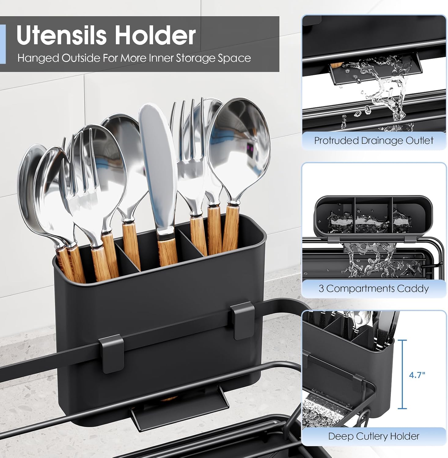 - [ 3-Grid Cutlery Holder ]: The 3-grid cutlery holder keeps forks, knives, and spoons neatly separated and dry. Water drains directly into the board, saving inner storage space and maintaining tidiness.