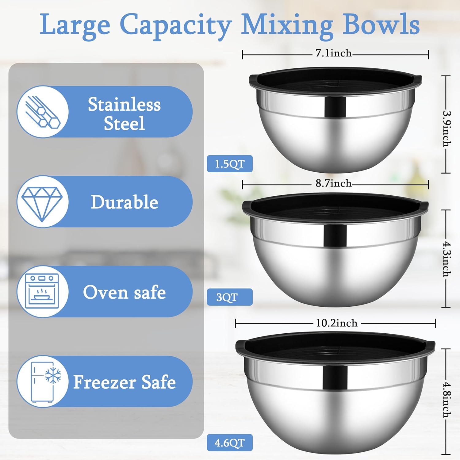 - 3 Size Bowls for Versatility: includes 1.5QT, 3QT, and 4.6QT bowls, gives you more flexibility and less mess to satisfy your essential cooking needs, ideal for preparing, mixing, washing, marinating, serving and storing food, also perfect for bbq