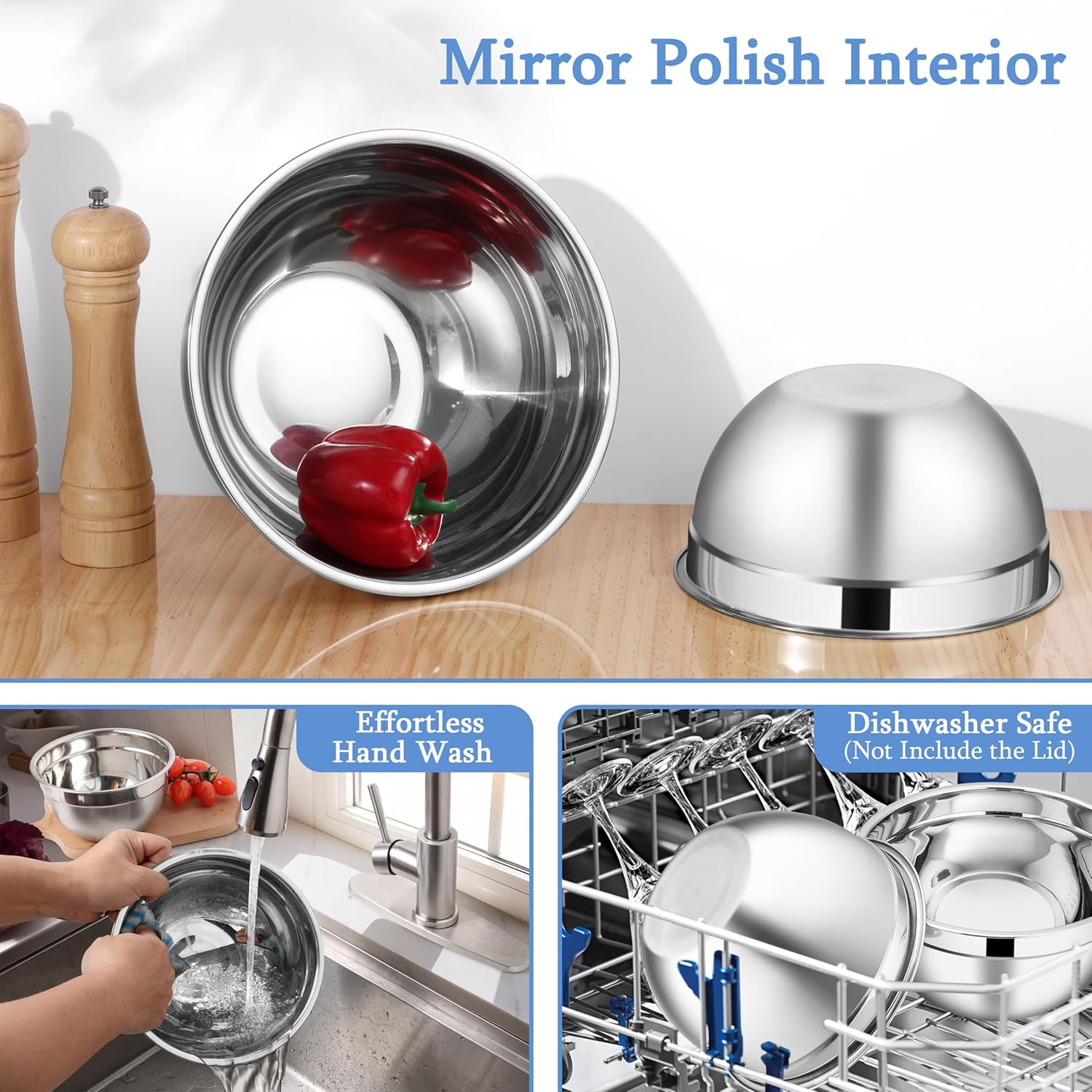 - Dishwasher Safe for Easy Cleaning: with its mirrored polished interior, these stainless steel mixing bowls can be easily cleaned by hand, and are also safe for dishwasher-safe, but it is better to hand wash the lids to prevent deformation caused by high temperature