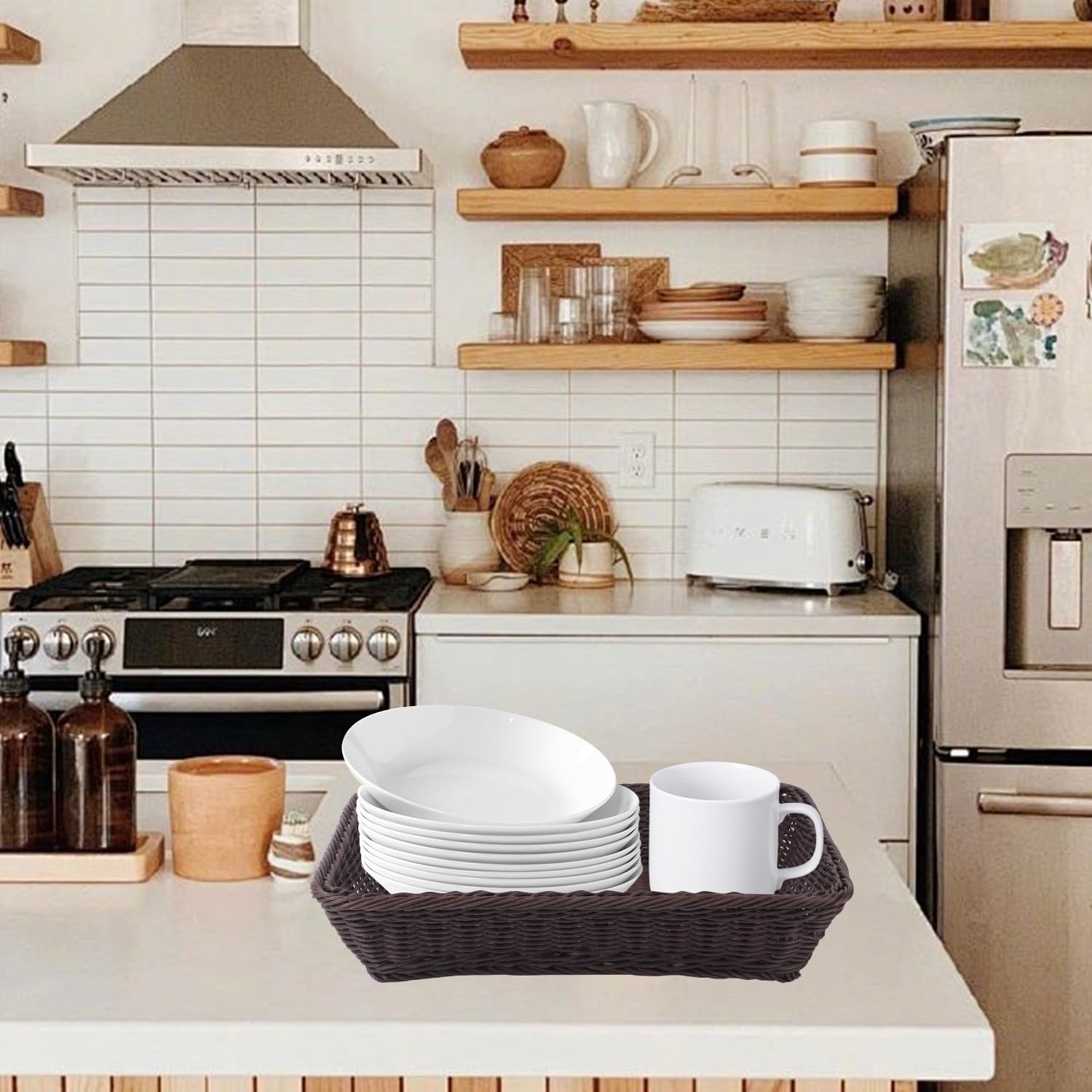 - 【Spacious Design with Elegant Deep Coffee Color】 Each 16 Inch wicker bread basket measures 40x30x8cm (16 inches) and features a generous size for storing larger items. The elegant deep coffee color mimics the natural look of woven wicker, adding a touch of rustic charm to any space.