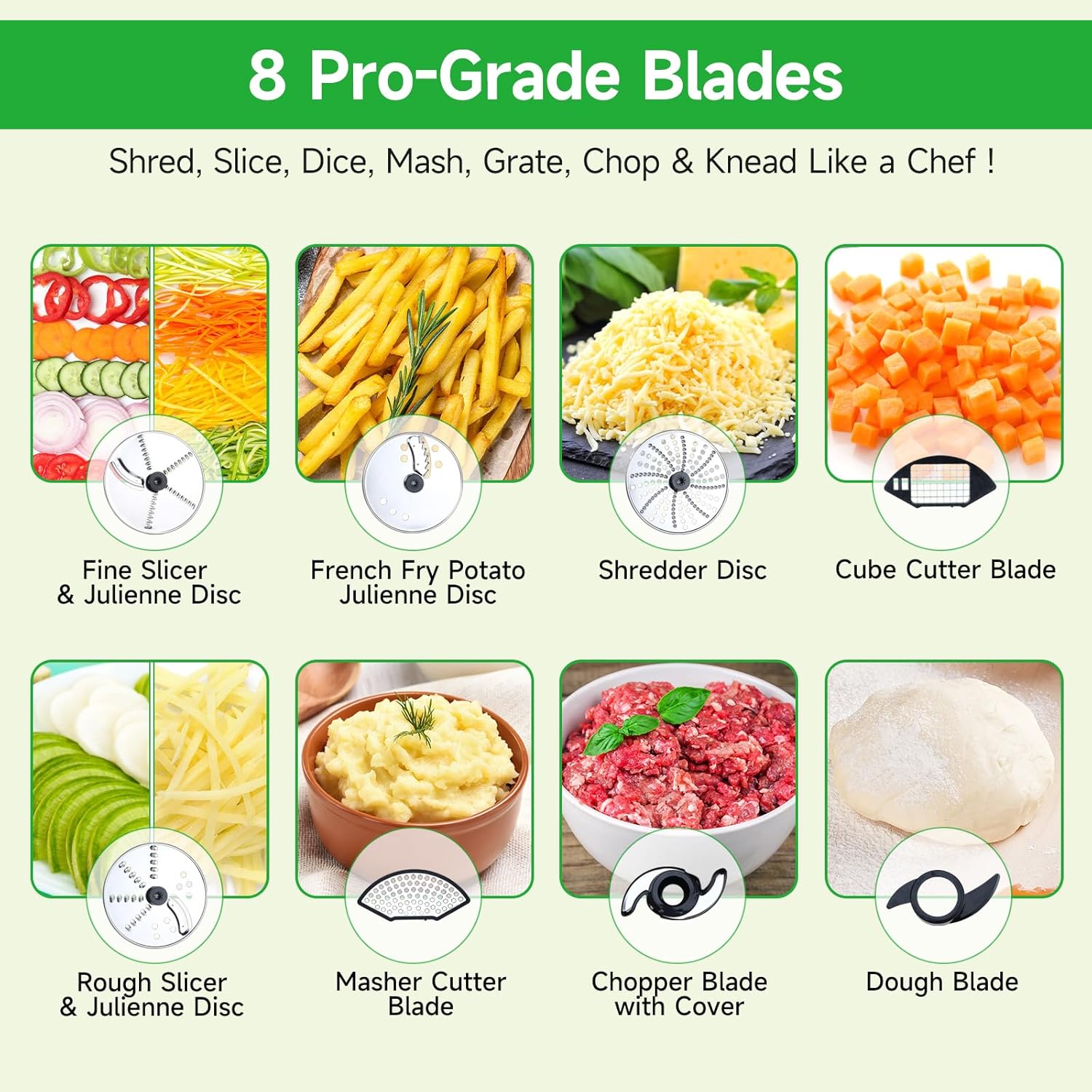 - ⚙️ 【Pro-Grade Blades & Accessories – Ready for Anything!】 Includes 8 durable blades (French fried potato shred disc, reversible rough and fine slicer& julienne discs, shredder disc, cube cutter, masher blade, a S blade and a dough blade) to tackle any recipe. Dice onions, mash potatoes, or blend creamy hummus—all with quick-swap attachments in this multifunctional food processor!