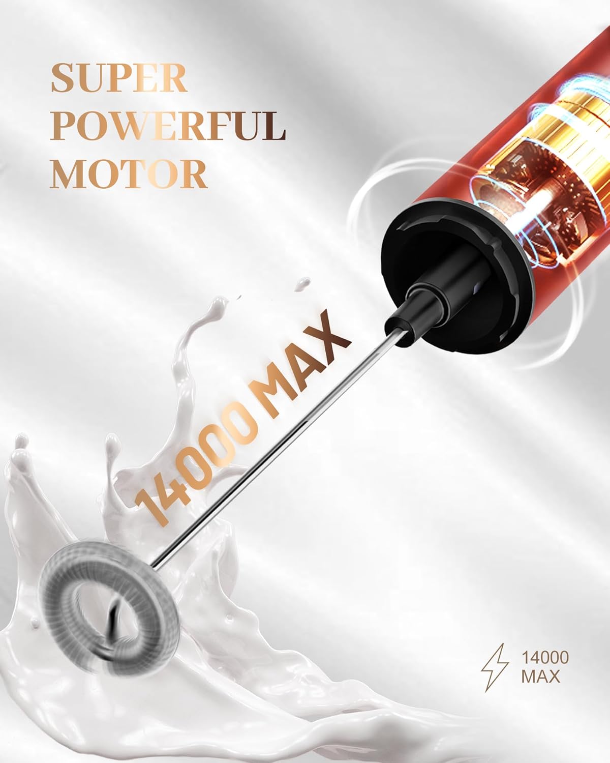 - Powerful Coffee Frother: Engineered by our expert team, it features a high-power turbocharged motor with a maximum speed of 13,000 RPM Β±10%. It can whip up smooth, delicate coffee in just 15 seconds. For morning coffee enthusiasts, this elegant frother lets you top your coffee with velvety foam at lightning speed, even on the busiest mornings