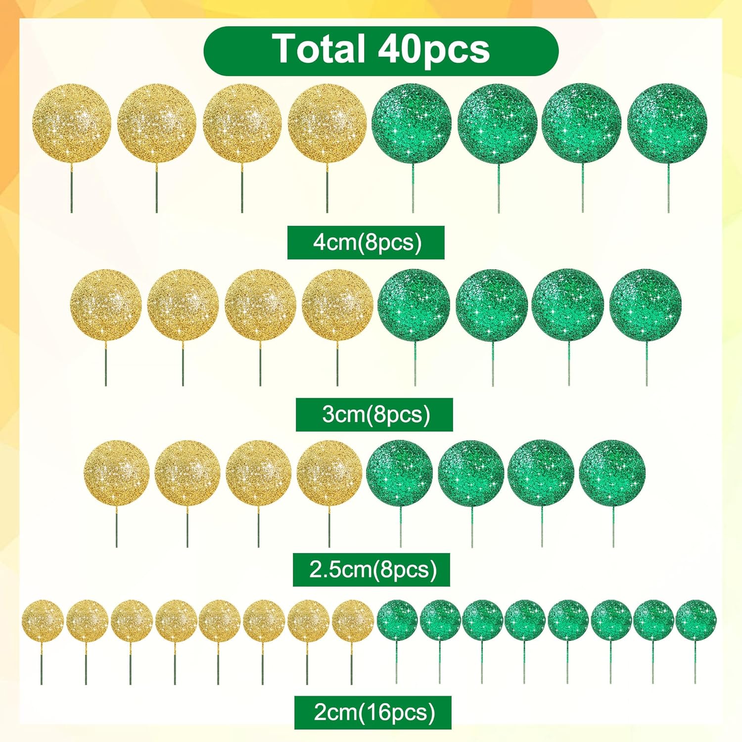 BEISHIDA 40 Pcs Ball Cake Toppers Mini Balls Cake Decorations Green Gold Foam Balls Sticks DIY Cake Topper for Baking Congrats Grade 2025 Graduation Birthday St Patrick's Day Decorations (Green Gold)