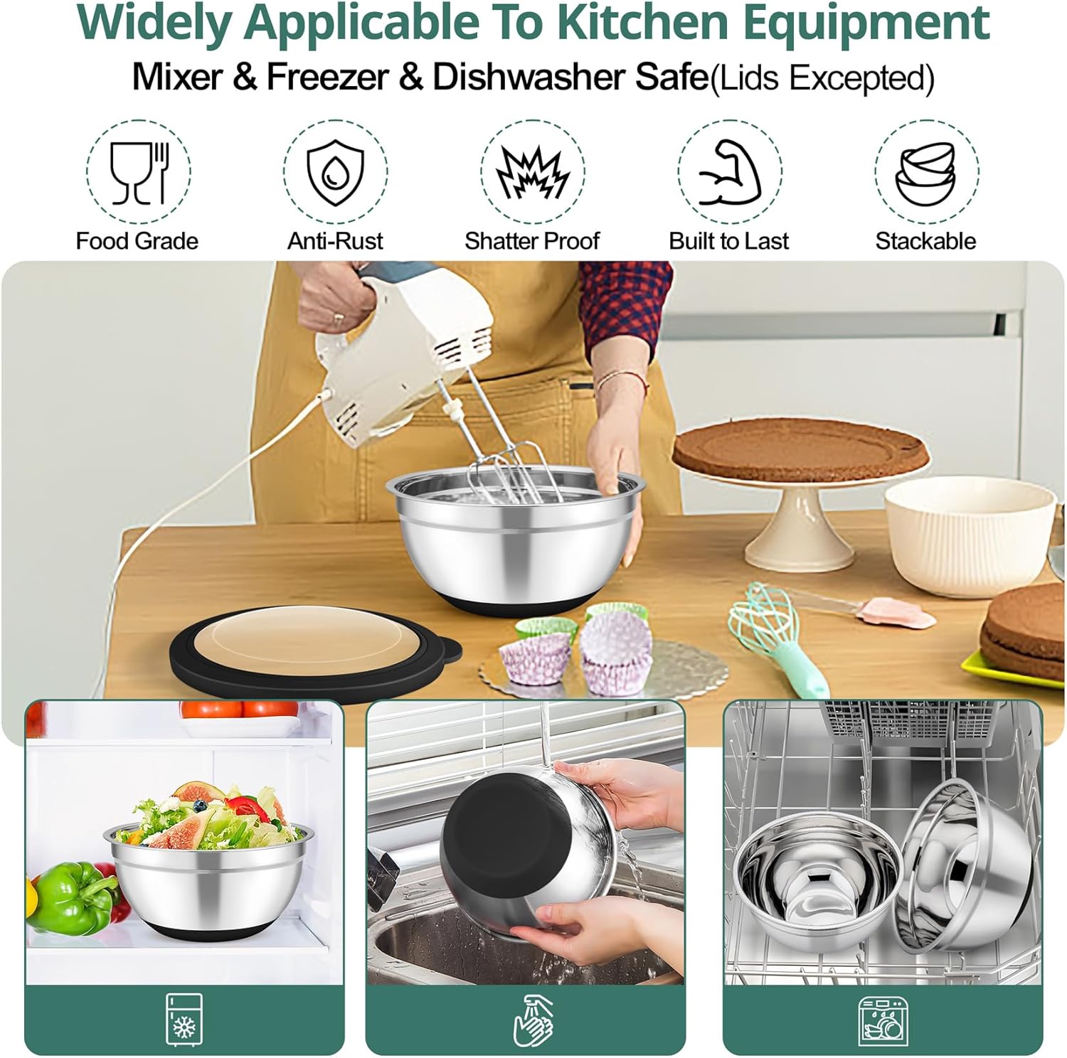 - FOOD-SAFE & LONGEVITY: Our mixing bowls with lids set is made of food grade stainless steel and non-toxic plastic lids, No harmful chemicals to ensure usersโ health and safety, Rust and chip resistant, Heavy duty construction make them not easy to break and deform, Stand the test of time and great for long-term use, A huge plus โ the bowls are oven safe except for the lids