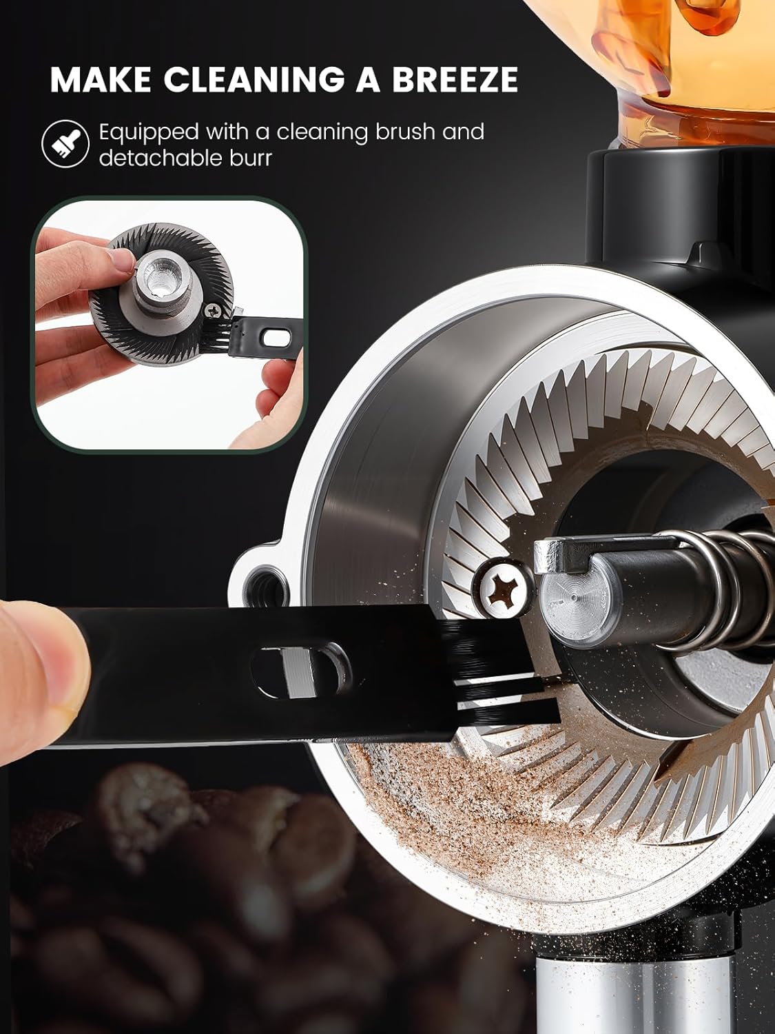 - [Fully sealed grinding] The upgraded closed-system design integrates the ground outlet and receiving cup into a unified structure, eliminating flying coffee grounds. Featuring a Light-shielding bean hopper that can hold up to 8oz of coffee beans and equipped with an anti-jumping bean design, Huanyu burr coffee grinder ensures a smooth grinding