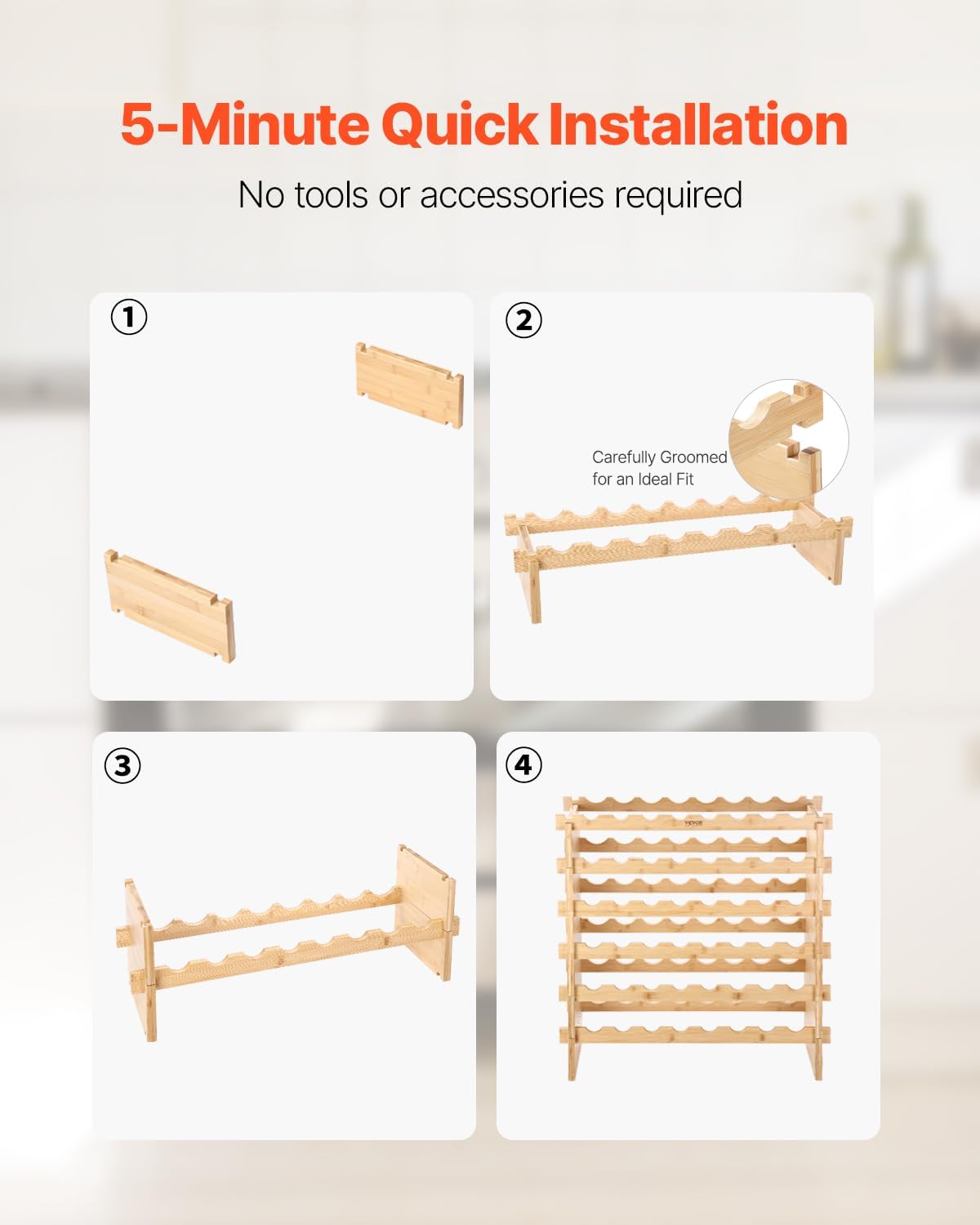 - Effortless Assembly: Assemble the wine storage rack in just 5 minutes—no tools, nails, or screws required. Ensure proper part alignment during assembly. For security, remove all bottles before repositioning the rack