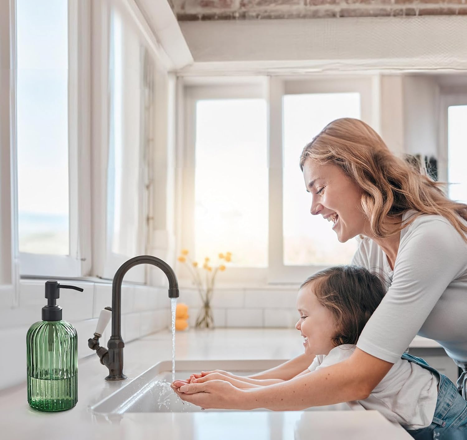 - BEAUTIFUL SOAP DISPENSER: Vintage Style Fluted Soap Dispenser with Black Rustproof Pump. Dark Green Glass Soap Dispenser Added a Farmhouse Touch of Color the Bathroom and Kitchen Sink.