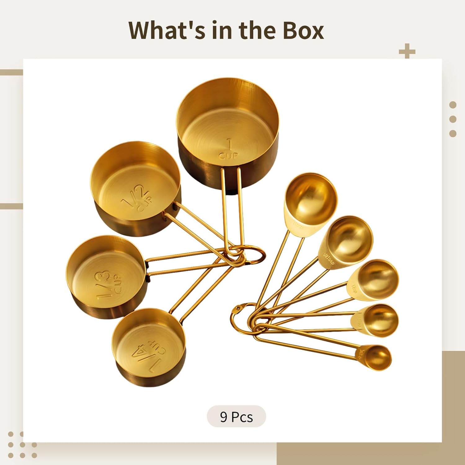 Stainless Steel Measuring Cups and Spoons Set, 9 Piece with Engraved Marks, Food Safe, Easy Stack Gold Measuring Set for Baking and Cooking