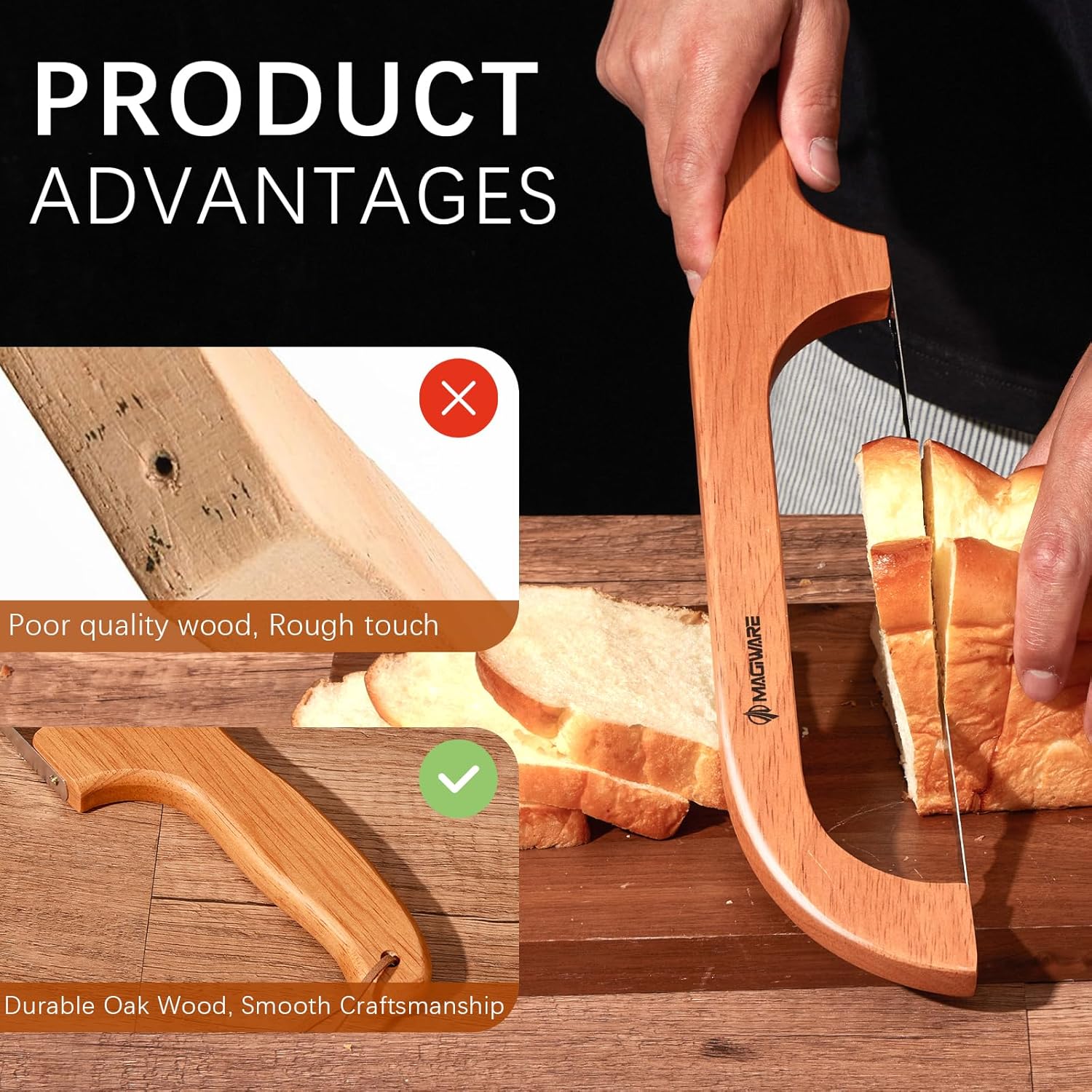 - HIGH QUALITY: The bread bow knife is crafted from a single piece of natural oak hardwood paired with food-grade stainless steel blade, no glued joints, durable and super sharp, combines rustic elegance with unwavering strength.