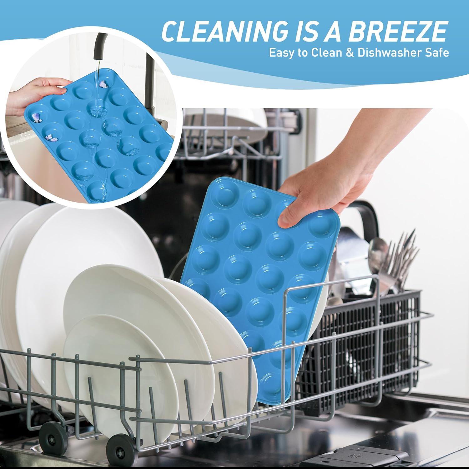• Food Grade Silicone Muffin Tray: Safe for the oven, microwave, dishwasher, fridge, and freezer. With an impressive heat resistance range from -104°F to 446°F, it’s perfect for all your favorite baked goods. thick walls prevent heat transfer to countertops – safer than other thin plastic baking cupcake muffin pans. Food grade silicone of our baking cupcake muffin pans, maintaining 99% "like-new" appearance after heavy use.