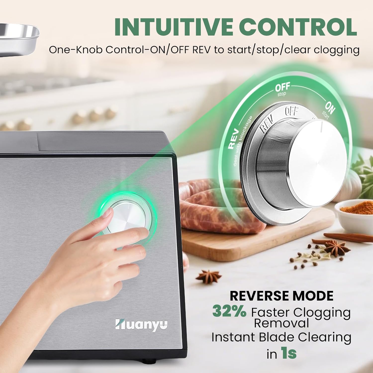 - [Intuitive control with reverse function] This heavy duty meat grinder Simplify grinding with a single knob (ON/OFF/REVERSE) β instantly clear jams by reversing the blade, ensuring smooth operation even with tough cuts