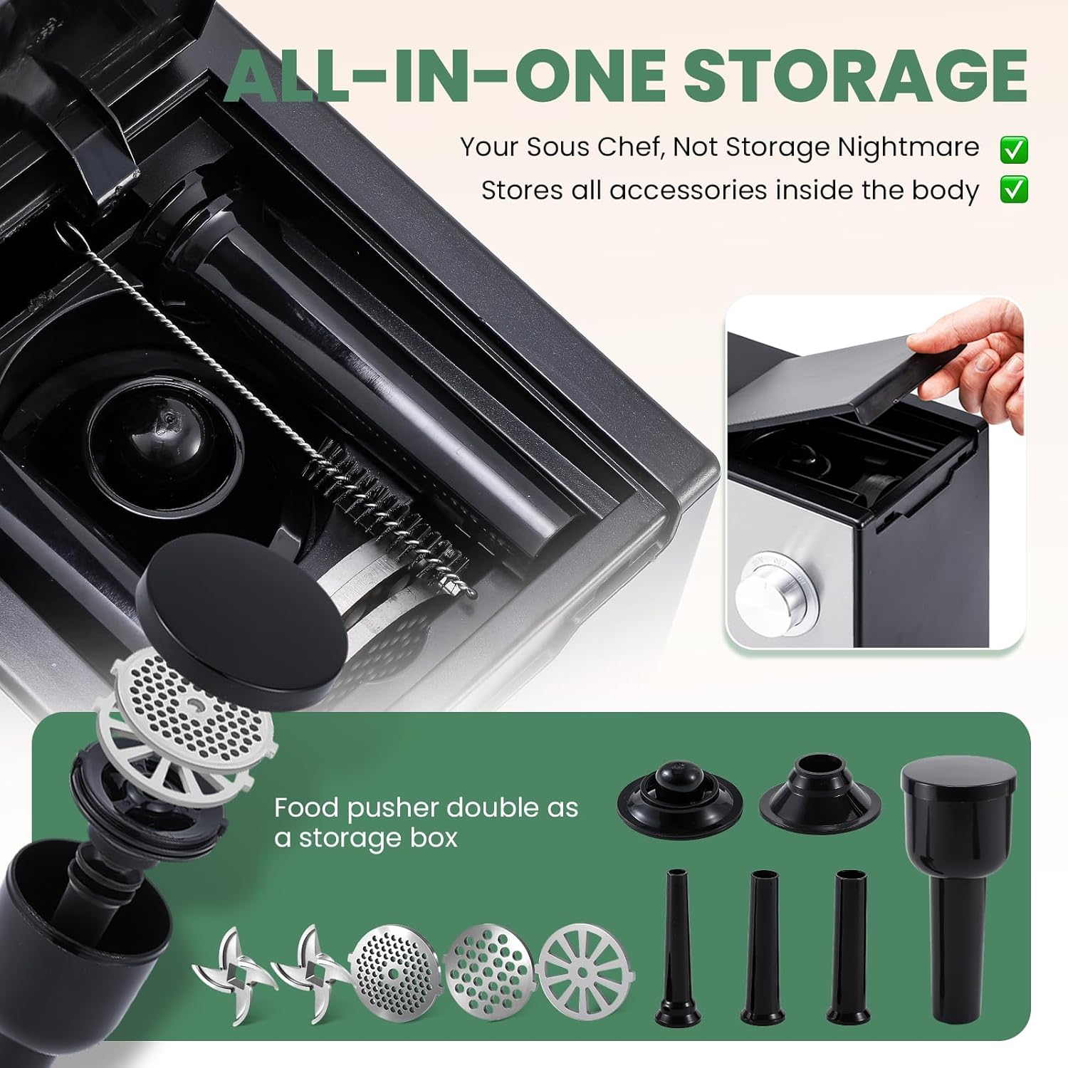 - [All-in-one storage design] The dual-purpose body of this stainless steel meat grinder stores all attachments (blades, plates, sausage kits) neatly inside, keeping your kitchen clutter-free. Never lose accessories again