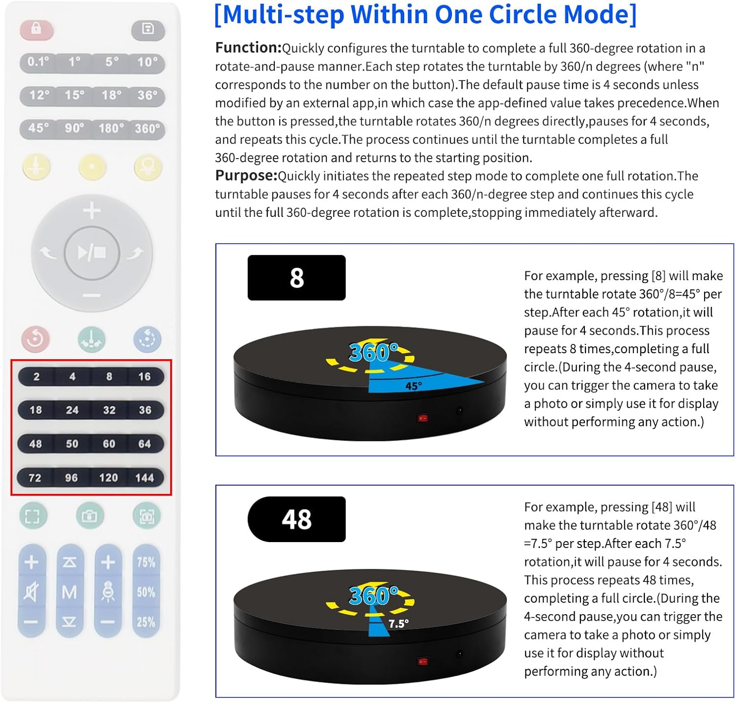 - 【The Motorized lazy susan Supports five rotation modes】: 【Continuous Rotation Mode】for Live Video Show.【Single-Step Mode】for Product Display and Live Demonstration.【Repeated Step Mode】 for Automated Product Display .【Multi-step Within One Circle Mode】for 360-Degree Multi-Angle Photography and 3D Scanning. 【Pendulum (Swing) Mode】 for Automatic Multi-Angle Front-and-Back Product Display. The intelligent multi-step within one circle mode makes shooting more streamlined and automated