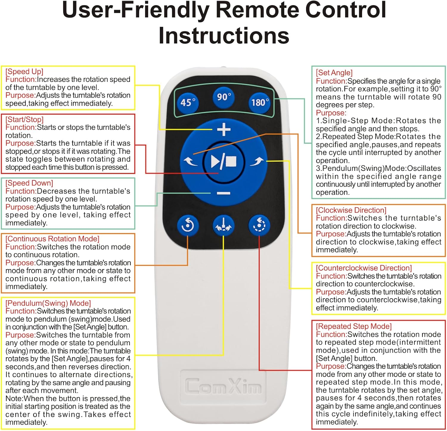 - 【Electric turntable Supports remote control of four rotation modes】: Continuous rotation. Single-step rotation at 45°, 90°, and 180°. Repeated step rotation at 45°, 90°, and 180°. Pendulum (swing) rotation at 45°, 90°, and 180°. Allows remote control for both clockwise and counterclockwise rotation. Supports remote control for start/pause and speed adjustment (increase/decrease).