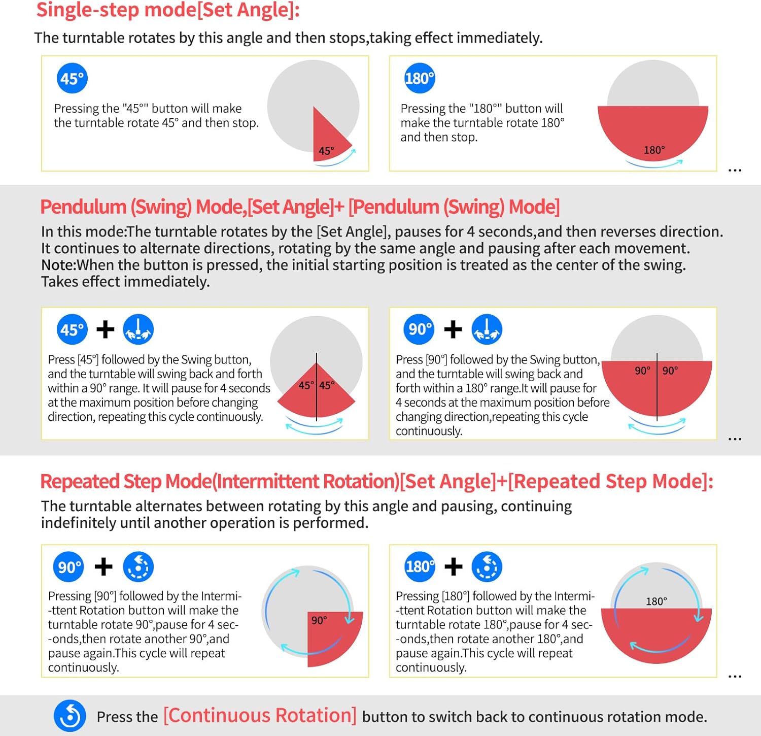 - 【Supports remote control of four rotation modes】: ComXim motorized display stand supports four rotation modes: Continuous rotation; Single-step rotation at 45°, 90°, and 180°; Repeated step rotation at 45°, 90°, and 180°; Pendulum (swing) rotation at 45°, 90°, and 180°. Allows remote control for both clockwise and counterclockwise rotation. Supports remote control for start/pause and speed adjustment (increase/decrease).