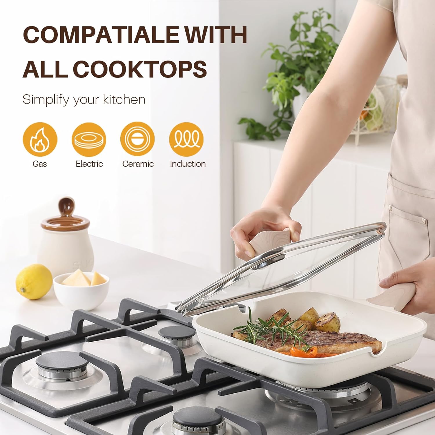 Nonstick Grilling Pan with Lid for Stove Tops, 9.5 Inch Square Grill Pan for Indoor Cooking, Healthy Coating Grill Skillet with Pour Spouts, Versatile Griddle, Induction Steak Pan, White