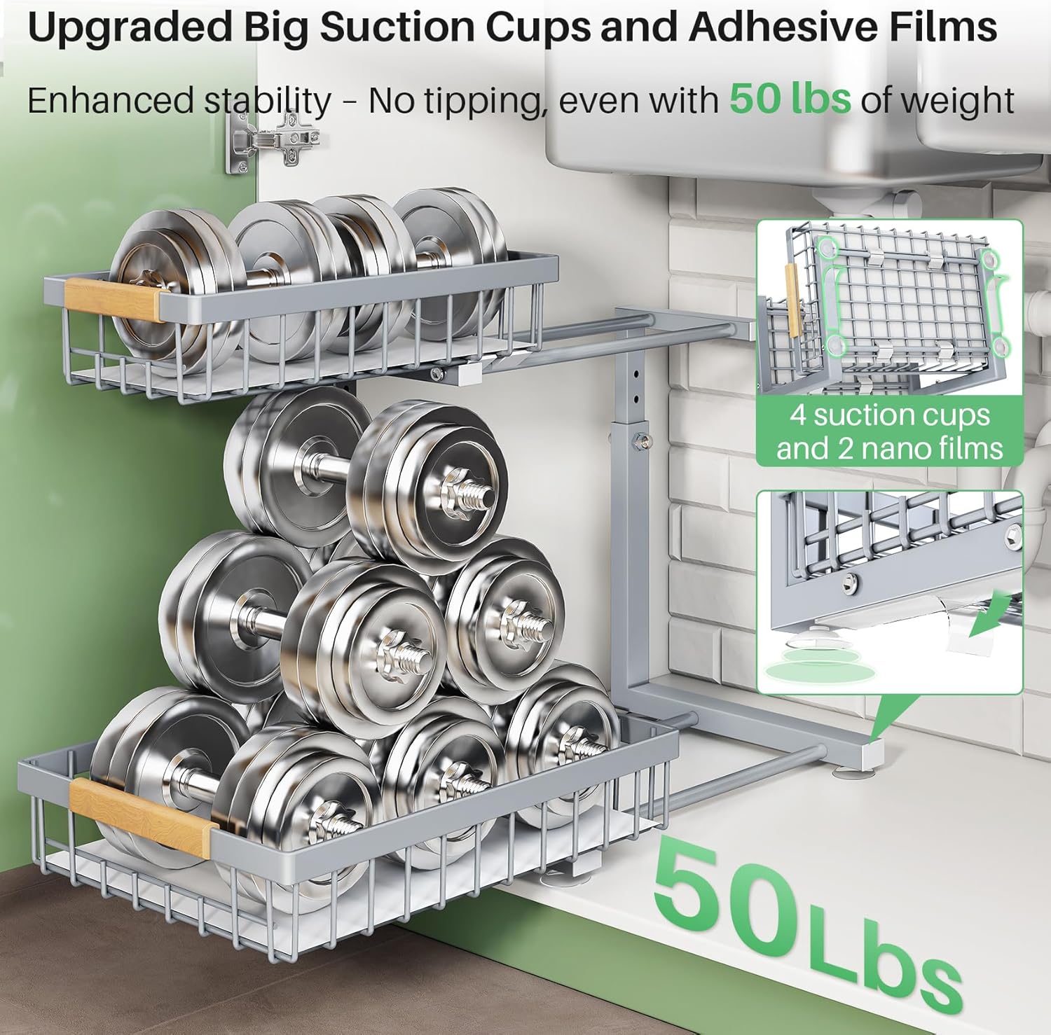 - Advanced Stability for Heavy Loads: With 4 large suction cups and 2 nano adhesive films, this under sink organizers and storage system provides exceptional stability, holding up to 50 lbs effortlessly. Its smooth pull-out design ensures no wobbling, making it the perfect kitchen sink organizer for secure and easy access.