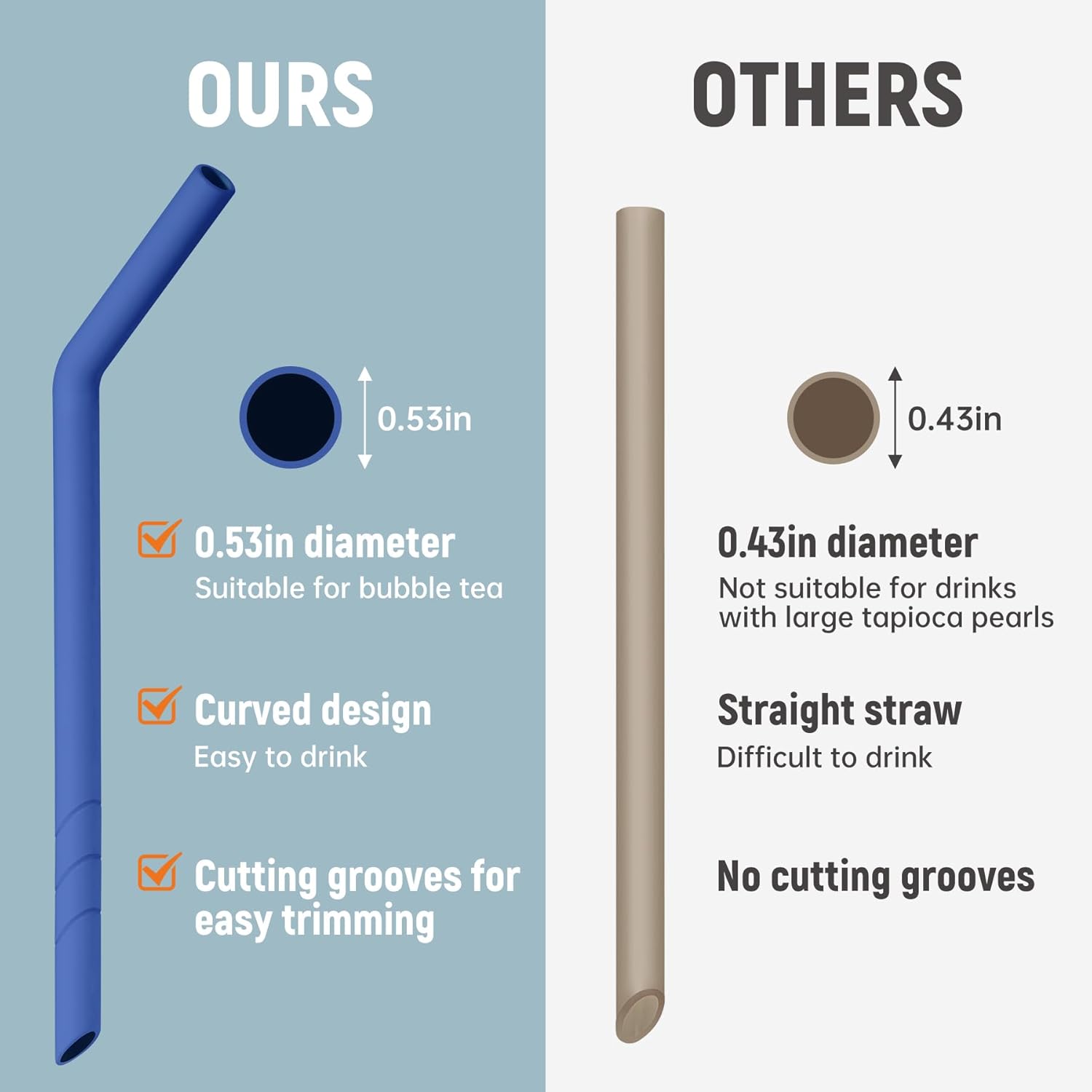 - Wider Diameter for Thick Drinks: Featuring a 0.39" inner diameter, these reusable silicone straws are perfect for bubble tea, smoothies, and milkshakes. Effortlessly sip thick drinks and large tapioca pearls without clogging.
