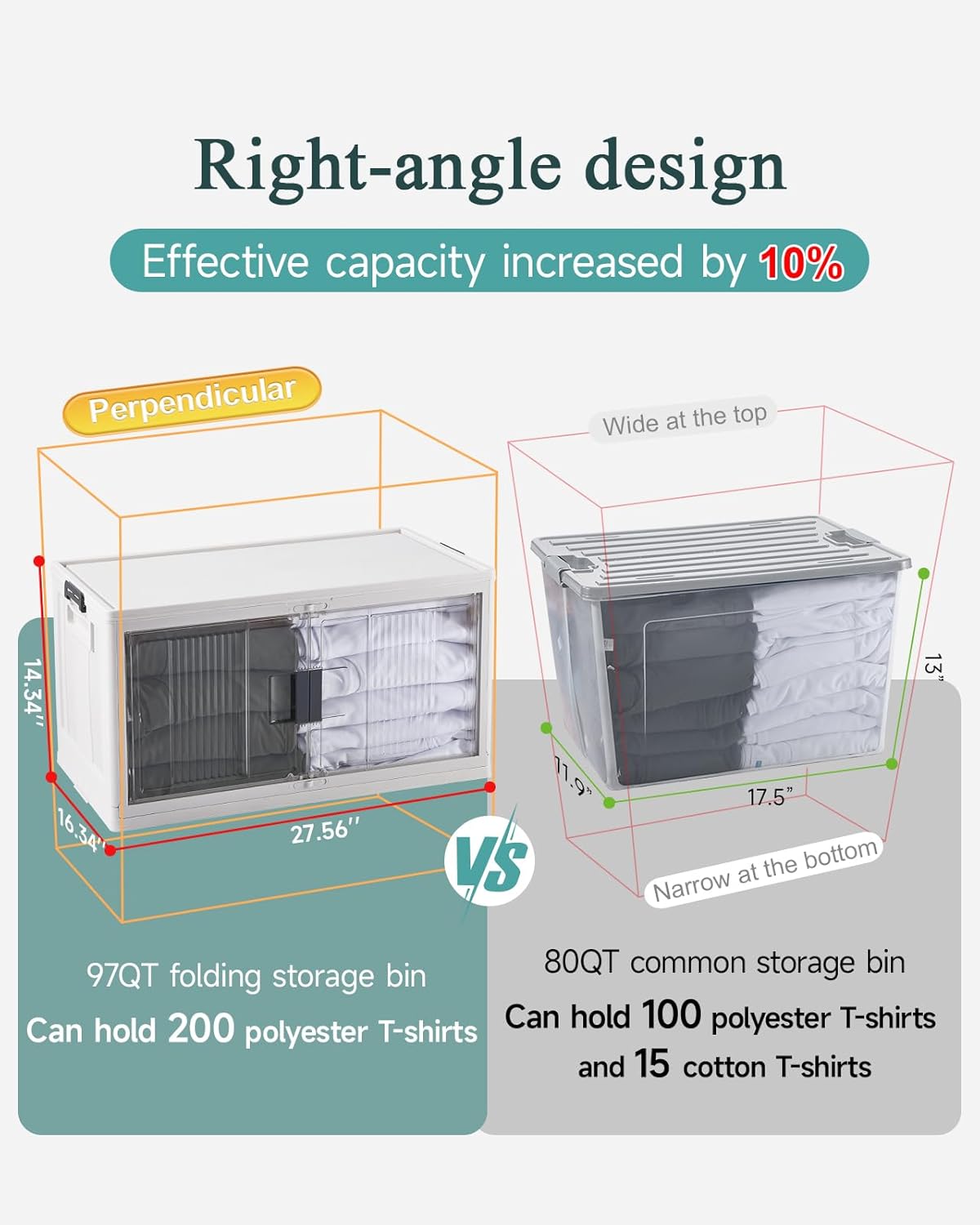 - Large Capacity: With dimensions of 23.8 inches (L) x 15.4 inches (W) x 13.3 inches (H) (2.17 inches when folded), these storage bins offer a spacious capacity of up to 97 quarts (24.25 gallons). They comfortably hold everyday items like cleaning supplies, snacks, office materials, and seasonal decorations. Their robust construction can support weights of up to 210 pounds (95KG) of weight, making them suitable for heavier items like books and tools