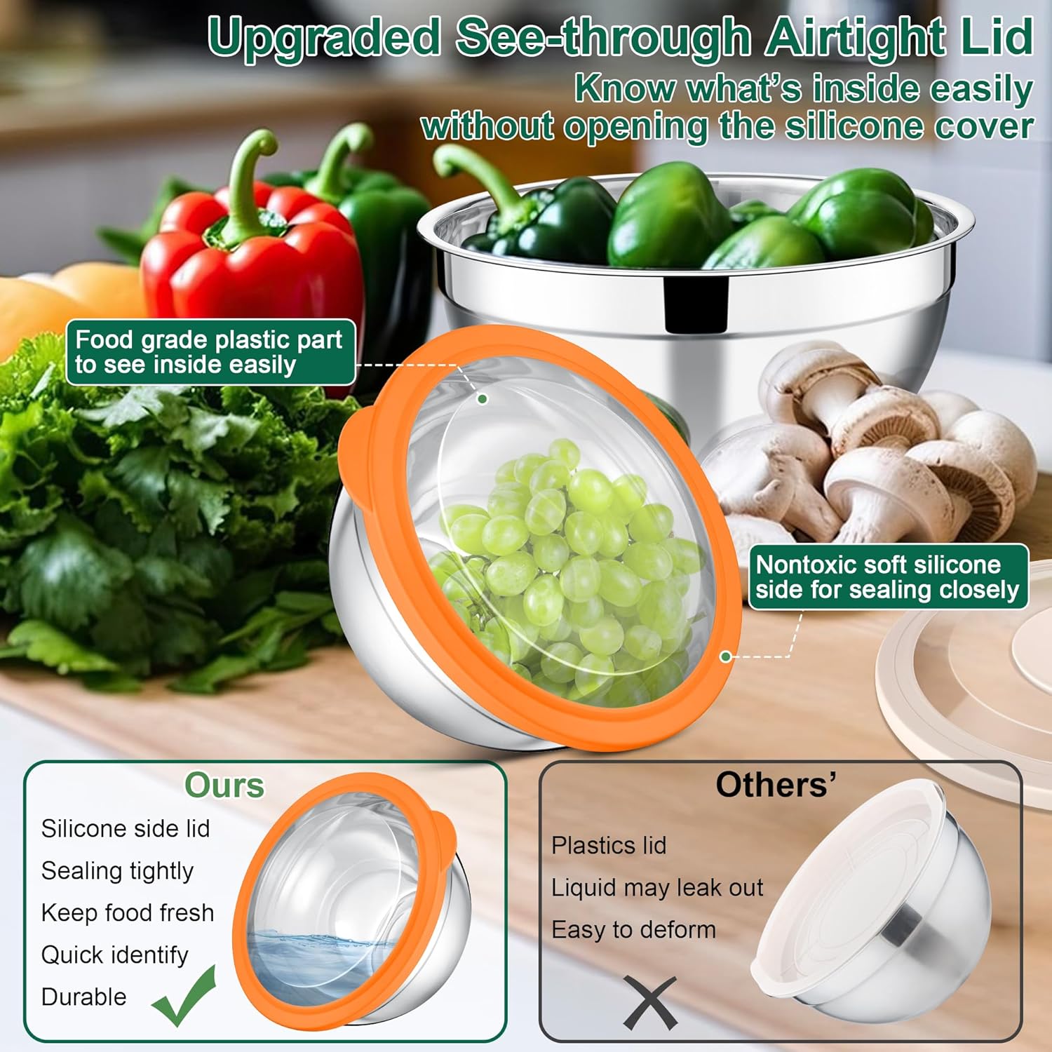 - UPGRADED AIRTIGHT CLEAR LIDS: The bowl's cover is compose of transparent plastic middle part and silicone edge, This design helps to quickly identify the food inside without opening the lid, Silicone side can seal tightly, No more worry of spilling and leaking, Make sure that less dust enters the bowl and lock the freshness, Suit for storing leftovers in the refrigerator, Take them as containers for serving food, The roll-rimmed edge and lid help to easily carry food for camping or picnics, Convenience to your daily life