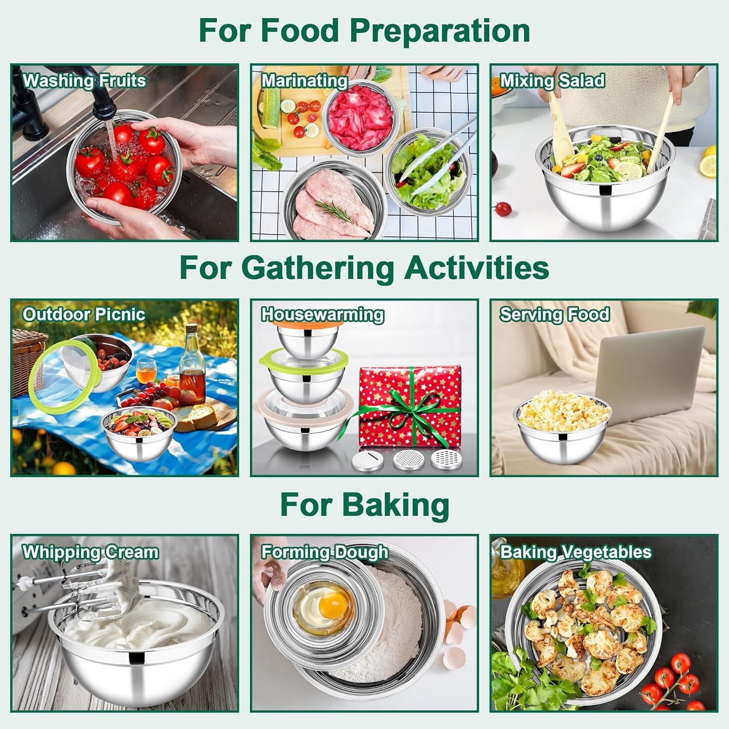 - HIGH QUALITY METAL MATERIAL: Our mixing salad bowls are made of premium stainless steel for anti-rust and corrosion proof, Oven safe (Exclude the covers) solid structure is shatterproof and not easy to deform, dent and break as the glass/plastic bowls, All mixing bowls without any chemical coating, Features a mirror-polished interior and a matte-polished exterior, Perform better scratch resistance and less water spot left for easy cleaning, Sturdy and healthy steel bowls for years to come