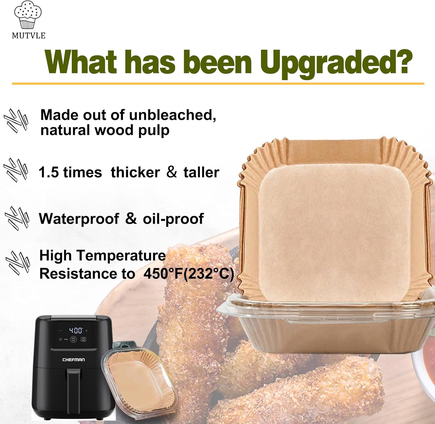 - Healthy and Reliable Material: Chefman air fryer liners disposable are made out of unbleached, natural wood pulp, with a plant based oil treatment, no fluorescent agent, BPA-free, PFAs-free. Heat resistant up to 450β/230β.