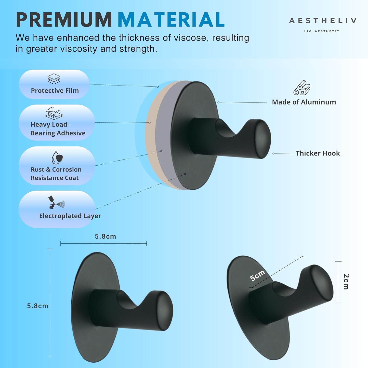 - Waterproof and Rust-Resistant – Perfect for Bathrooms and Kitchens : Built to thrive in high-moisture areas, our adhesive wall hooks are waterproof and rust-resistant, making them the ideal solution for organizing your bathroom, laundry room, or kitchen. Unlike metal hooks that rust over time, our premium black finish remains clean and sleek even in steamy or humid environments.