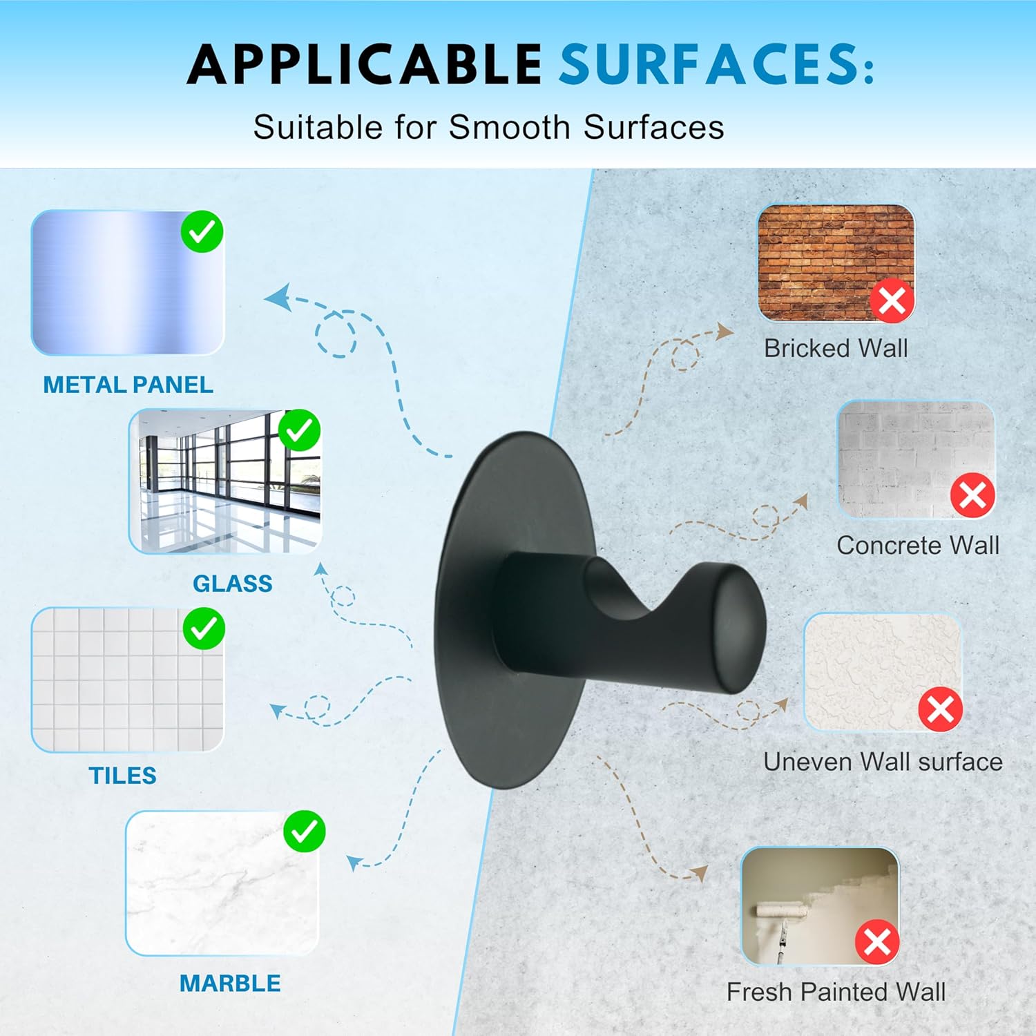 - Multi-Use Wall Hooks – Organize Every Corner of Your Home Our 4-pack of black adhesive wall hooks offers endless organization possibilities throughout your home. In the entryway, keep keys, coats, or dog leashes at arm’s reach. In the bedroom, hang accessories, hats, or bags with ease. In the bathroom, they’re perfect for towels, loofahs, and robes. The kitchen? Ideal for utensils, potholders, and cleaning cloths. Even in the garage, laundry room, or office, these hooks add functional storage without taking up space.