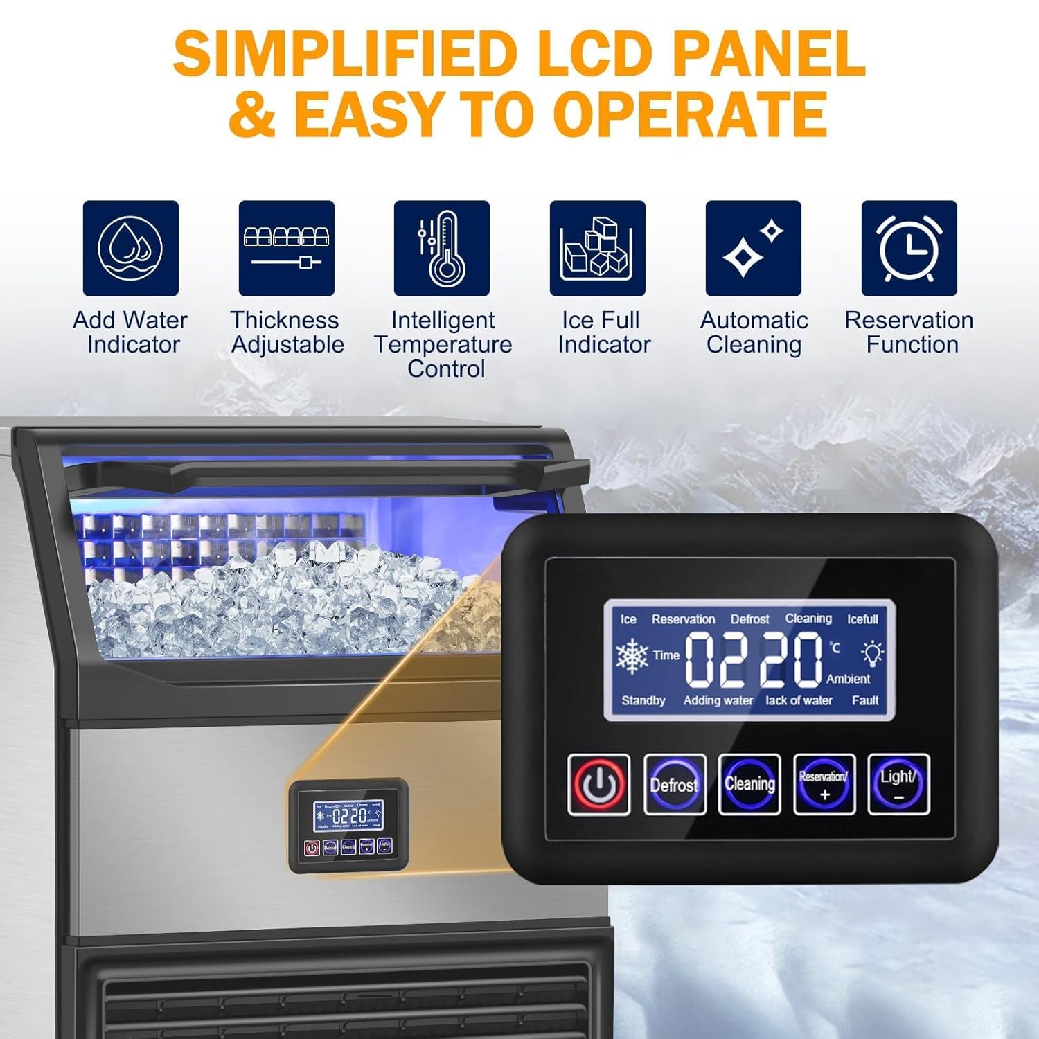 - Multiple Functions - The freestanding industrial commercial ice maker boasts an easy-to-operate control panel with adjustable ice cube thickness, one-touch auto cleaning, 24-hour reservations, defrosting, malfunction reminders, and water shortage reminders.