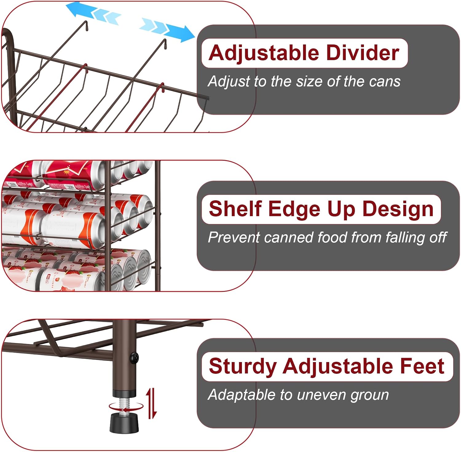 - 【Perfect Size for Small Spaces】The size of the can rack organizer for pantry is 17.12*11.02*25.2 inches, the small size of the stackable can organizer expands extra storage space for small spaces. Each tier comes with 2 adjustable dividers, which can help you sort and manage cans and beverages and keep the storeroom/cabinet/pantry in order.
