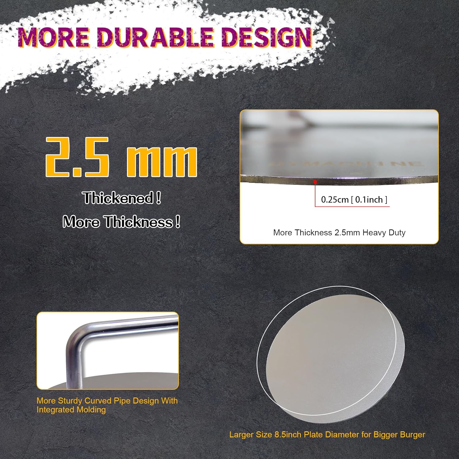 - Specially Designed For Large Meat Patties - DYMACHINE smash burger press made of brushed stainless steel 304 material, integrated bend tube forming, laser welded to the pressure plate in bottom, perfectly combined, extremely sturdy, ensuring worry free cooking time. The diameter of the bent pipe is 20mm, the wall thickness is 1mm, and the thickness of the pressure plate is 2.5mm. The higher thickness makes it easier to shape your meat patty, very practical!