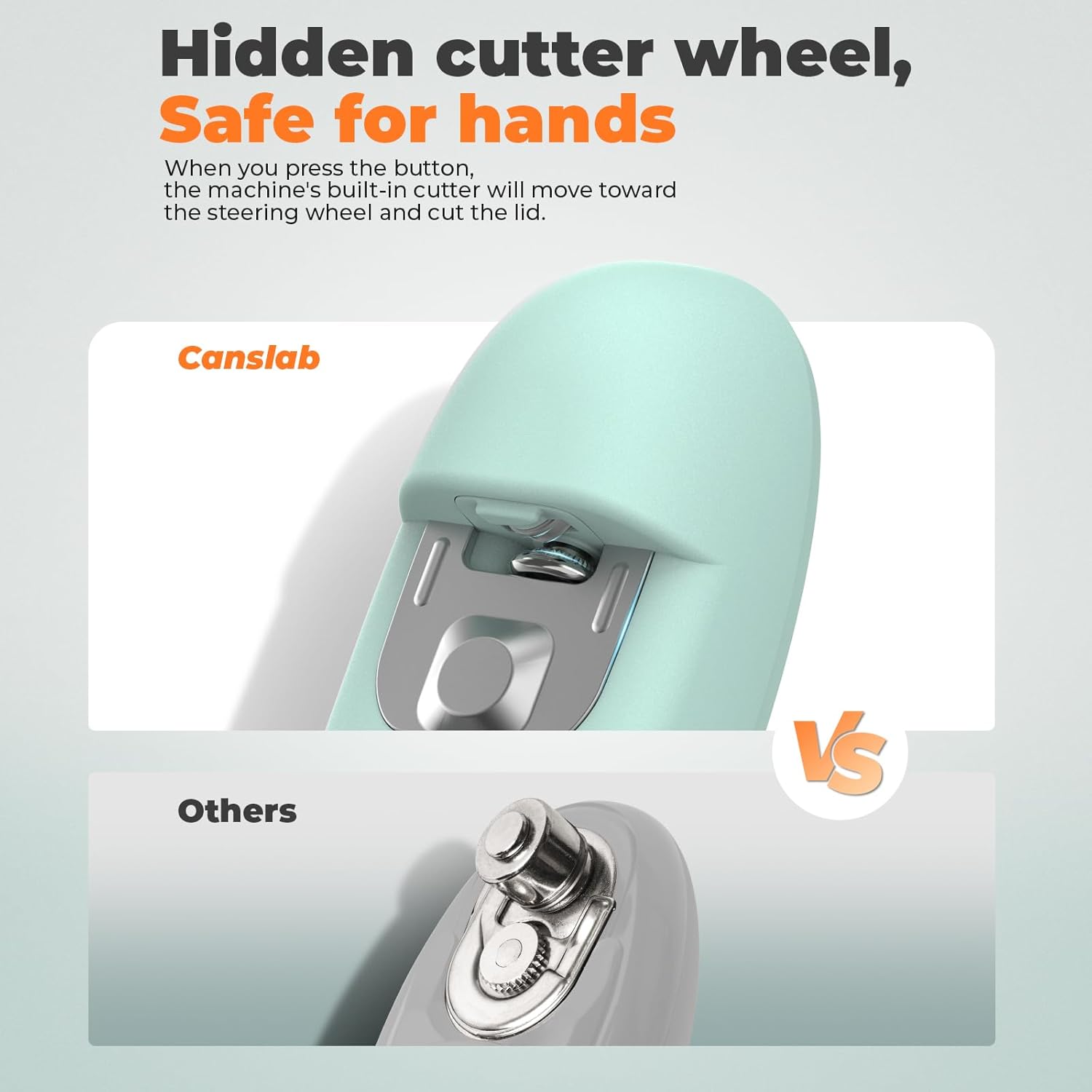 - 【USB RECHARGEABLE】- Canslab USB rechargeable can opener has a built-in 2000mAh rechargeable battery that opens approximately 100 cans*, which is 4 times the quantity cut by the aa batteries type until the batteries are drained. It is a cost-effective choice. Best for home kitchen and outdoor camping. *Data from Canslab lab, can sized 10.75oz. The number of cans opened may vary depending on the size of the can.