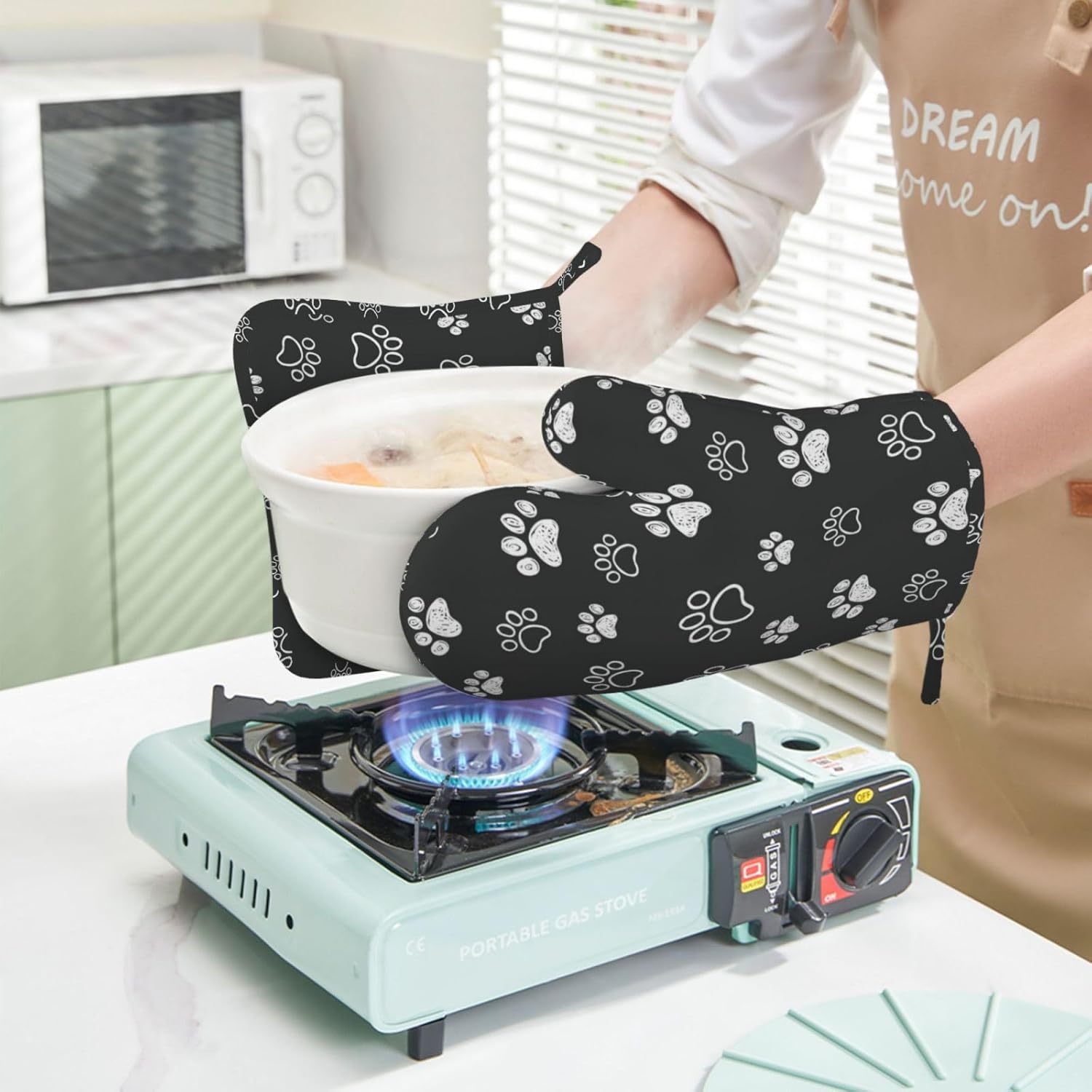 Dog Paw Print Oven Mitts and Pot Holders Set of 4 Silicone Black White Dog Paw Print Kitchen Mitten Gloves and Non-Slip Potholders Set Heat Resistant Oven Gloves Hot Holders for Kitchen