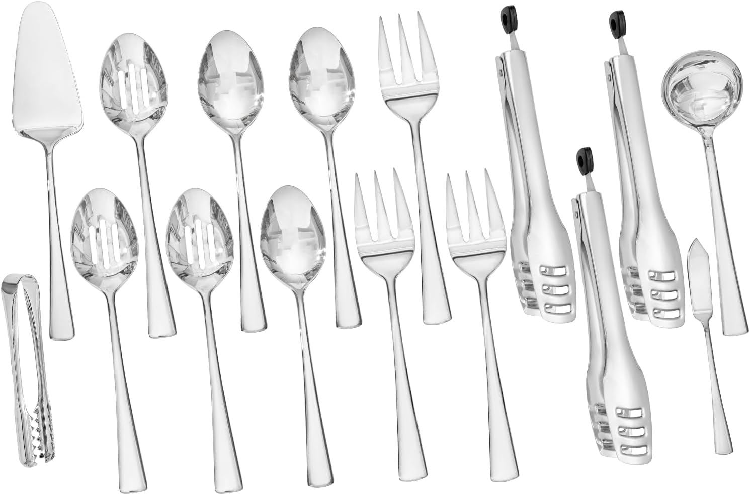 - Complete Serving Utensils Set of Components: 16 Piece serving utensils include 3 serving spoons(8.74inch),3 slotted spoons(8.8inch),3 serving fork(8.94inch),3 serving tong(9.75inch),1 soup ladle(8.5inch),1 cake server(10.4inch),1 butter knife(7.57inch), 1 ice tong(6.72inch)