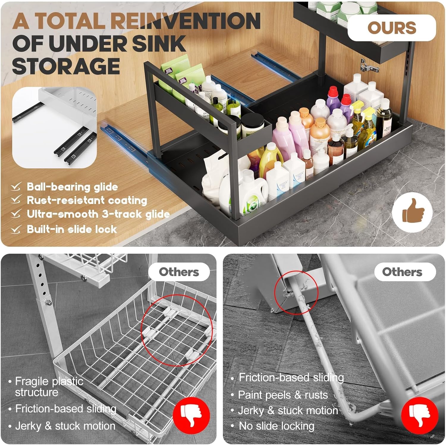 - 【A Major Leap in Sliding Performance】 Engineered with a triple ball-bearing slide rail system, this under sink organizer delivers an exceptionally smooth, stable glide—even under heavy loads. Unlike traditional friction-based two-rail designs, it eliminates wobble, resistance, and noise—offering a truly upgraded pull-out experience.