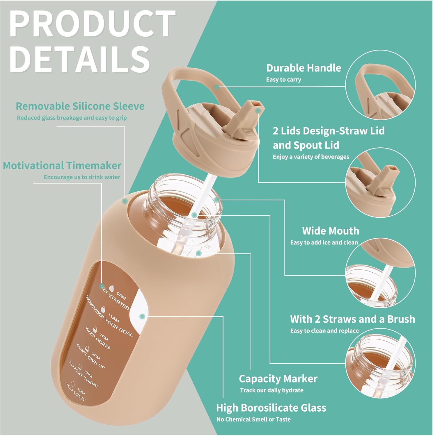 - GLASS WATER BOTTLE WITH SILICONE SLEEVE: The big water bottle for easy carry and use. The color of the silicone sleeve varies and stylish, provides impact protection, easy grip, no slips and reduced condensation. Enjoy the happy hour of drinking water