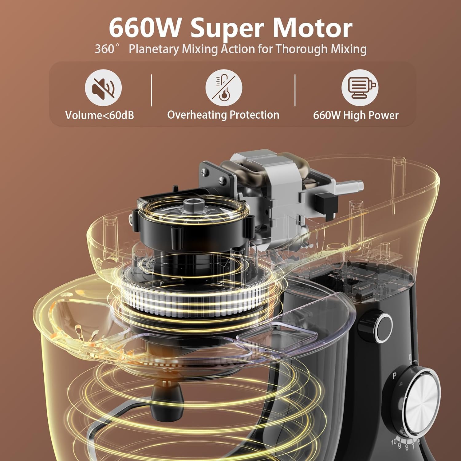 - 660W POWERFUL DYNAMICS - Powered by a precision-engineered 660W motor with copper-core technology, this mixer delivers high-torque performance . Its smart energy algorithm reduces power consumption by 35% compared to conventional models. The dual-cooling system ensures continuous 1-hour operation without overheating.